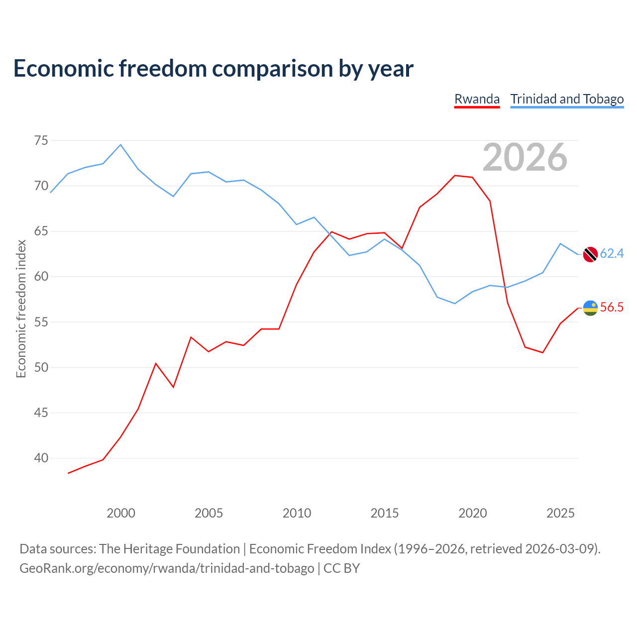 The Economic Freedom Index for Rwanda is 56.5, ranking 121/197, compared to 62.4 for Trinidad and Tobago, ranking 87/197. The chart above displays a comparison of annual changes in economic freedom indexes.