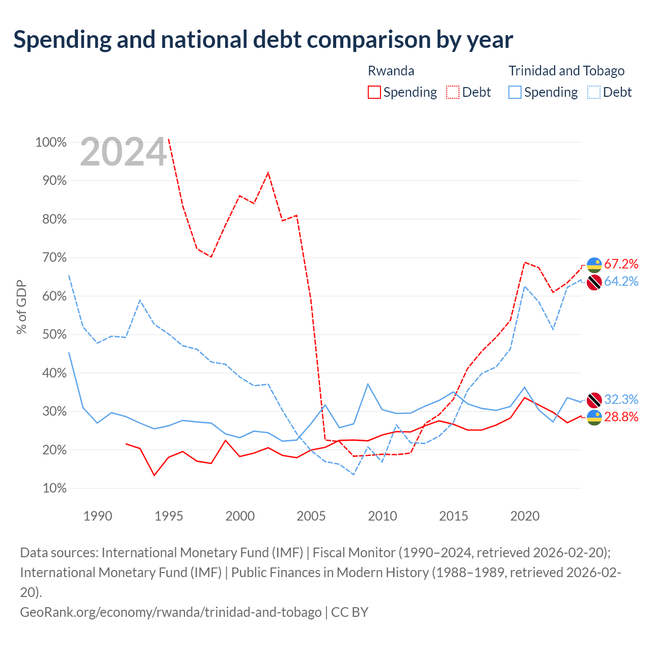 Rwanda has $9.58B in government debt (67.2% of GDP), compared to $16.5B (64.2% of GDP) in Trinidad and Tobago.