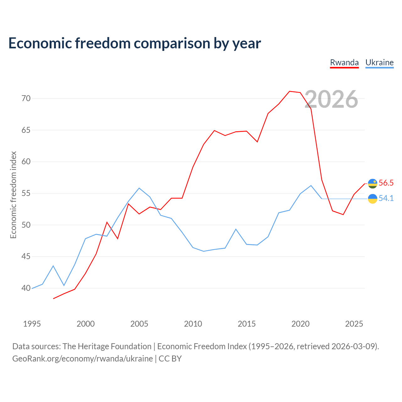 The Economic Freedom Index for Rwanda is 56.5, ranking 121/197, compared to 54.1 for Ukraine, ranking 135/197. The chart above displays a comparison of annual changes in economic freedom indexes.