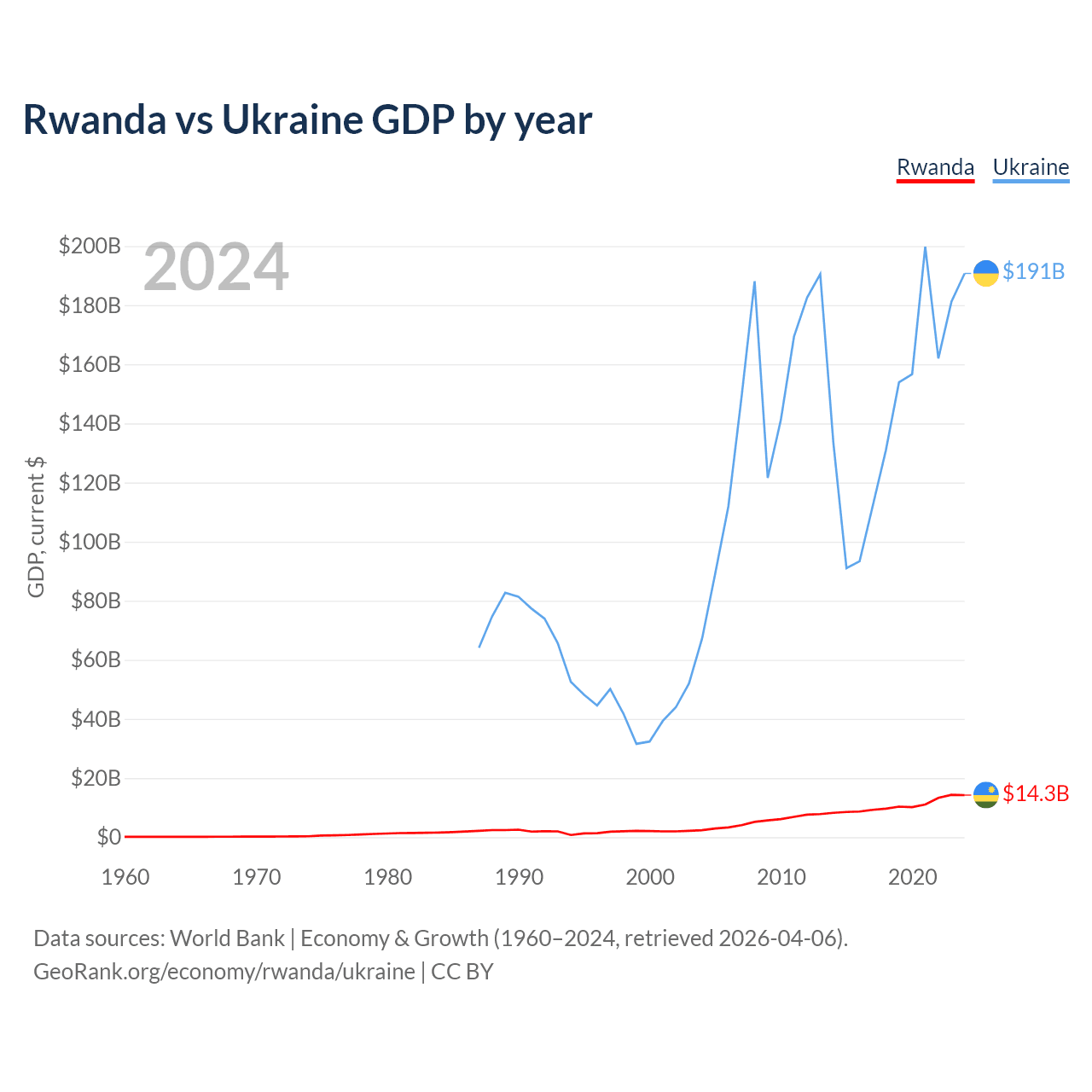Rwanda has a GDP of $14.3B compared to $191B for Ukraine, ranking 144/197 and 57/197 by economy size, respectively.