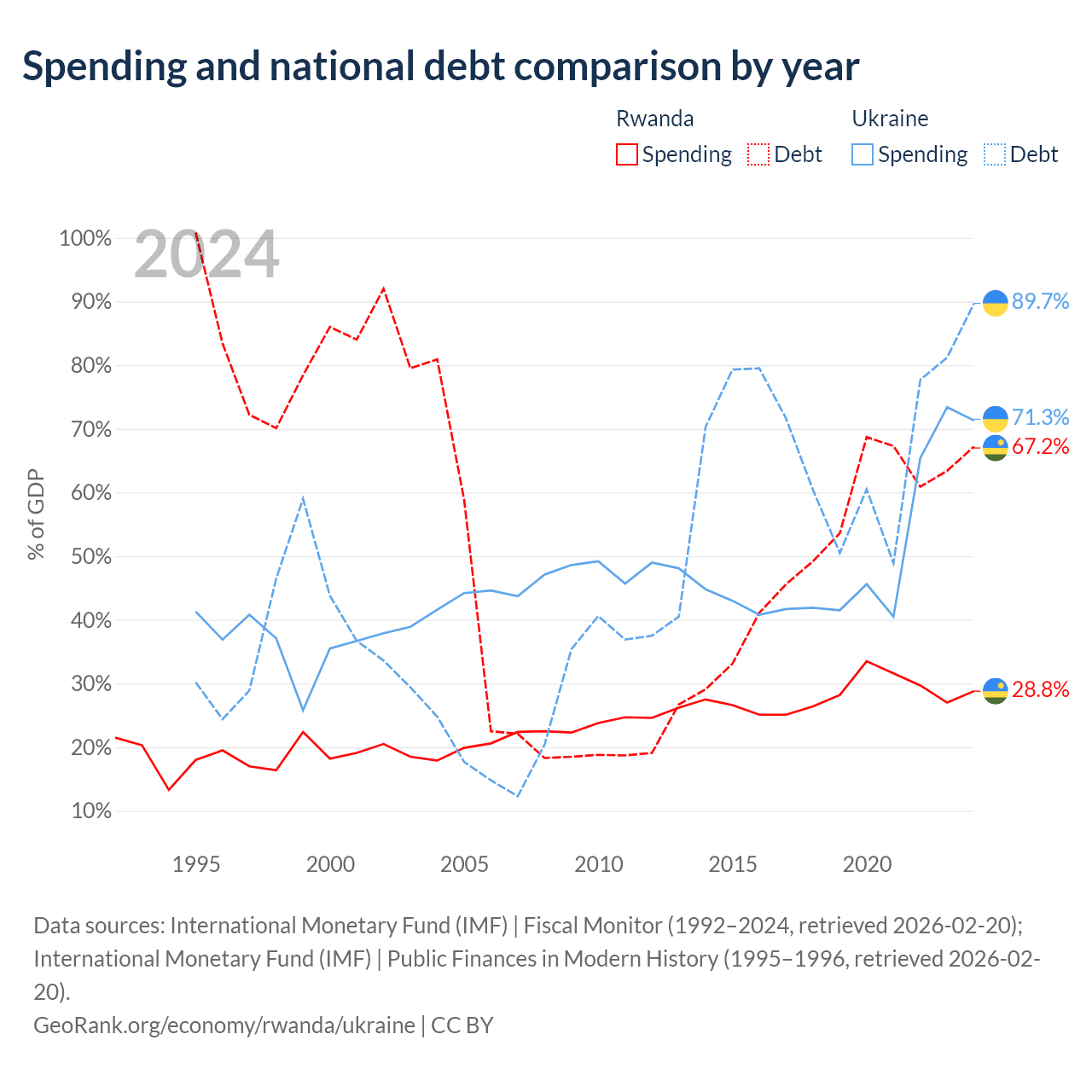 Rwanda has $9.58B in government debt (67.2% of GDP), compared to $171B (89.7% of GDP) in Ukraine.