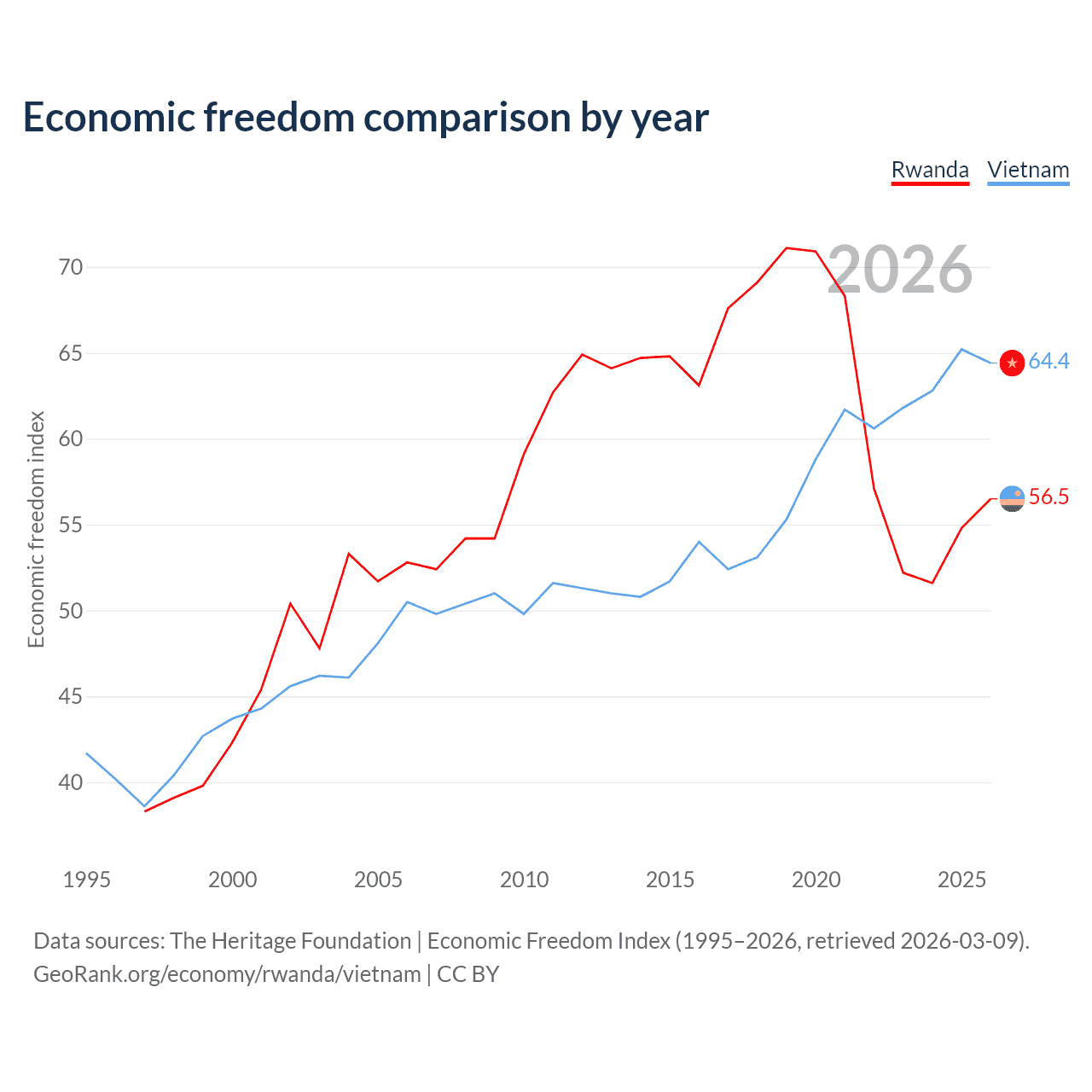 The Economic Freedom Index for Rwanda is 56.5, ranking 121/197, compared to 64.4 for Vietnam, ranking 73/197. The chart above displays a comparison of annual changes in economic freedom indexes.