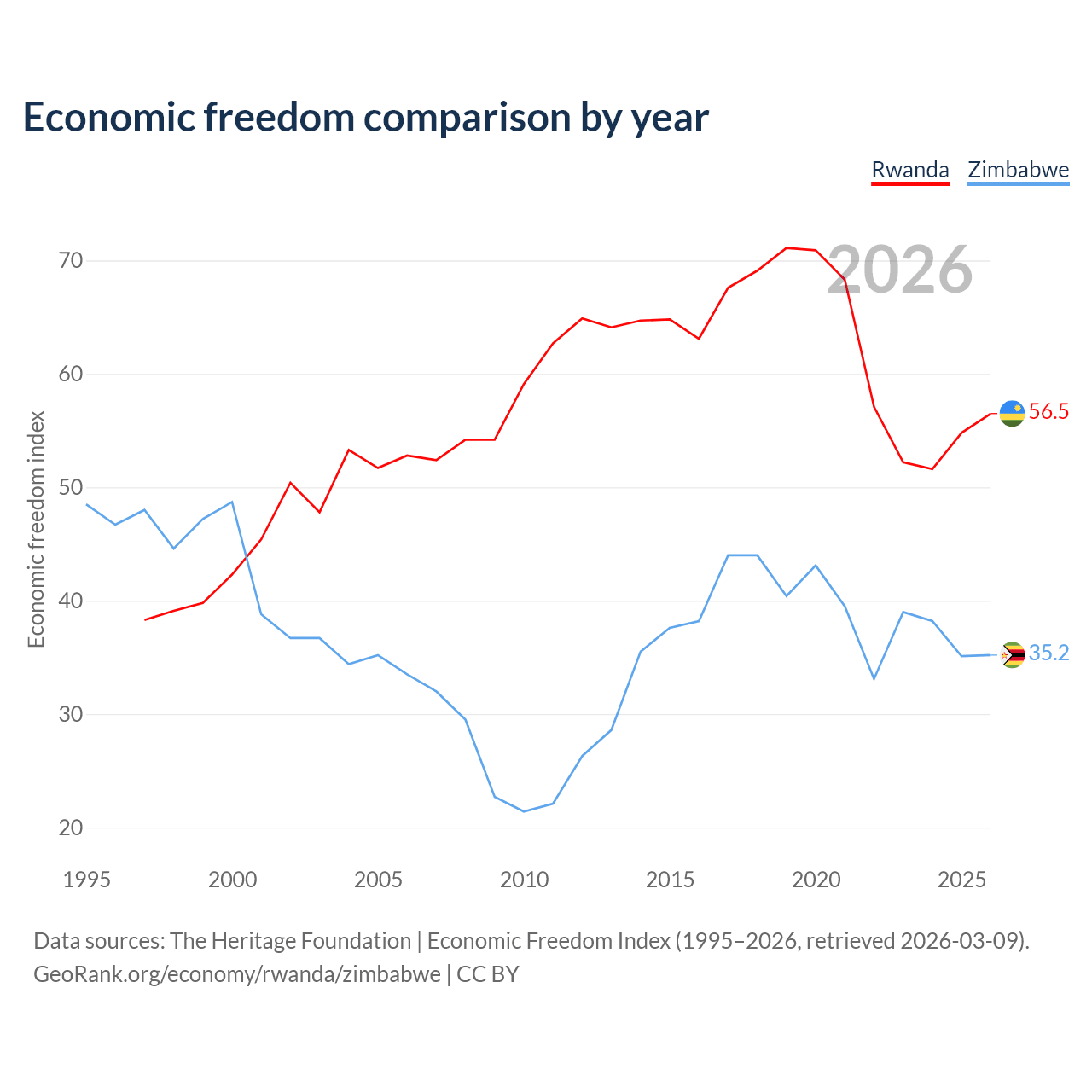 The Economic Freedom Index for Rwanda is 56.5, ranking 121/197, compared to 35.2 for Zimbabwe, ranking 190/197. The chart above displays a comparison of annual changes in economic freedom indexes.