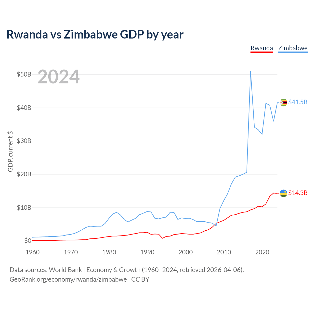 Rwanda vs Zimbabwe GDP by year