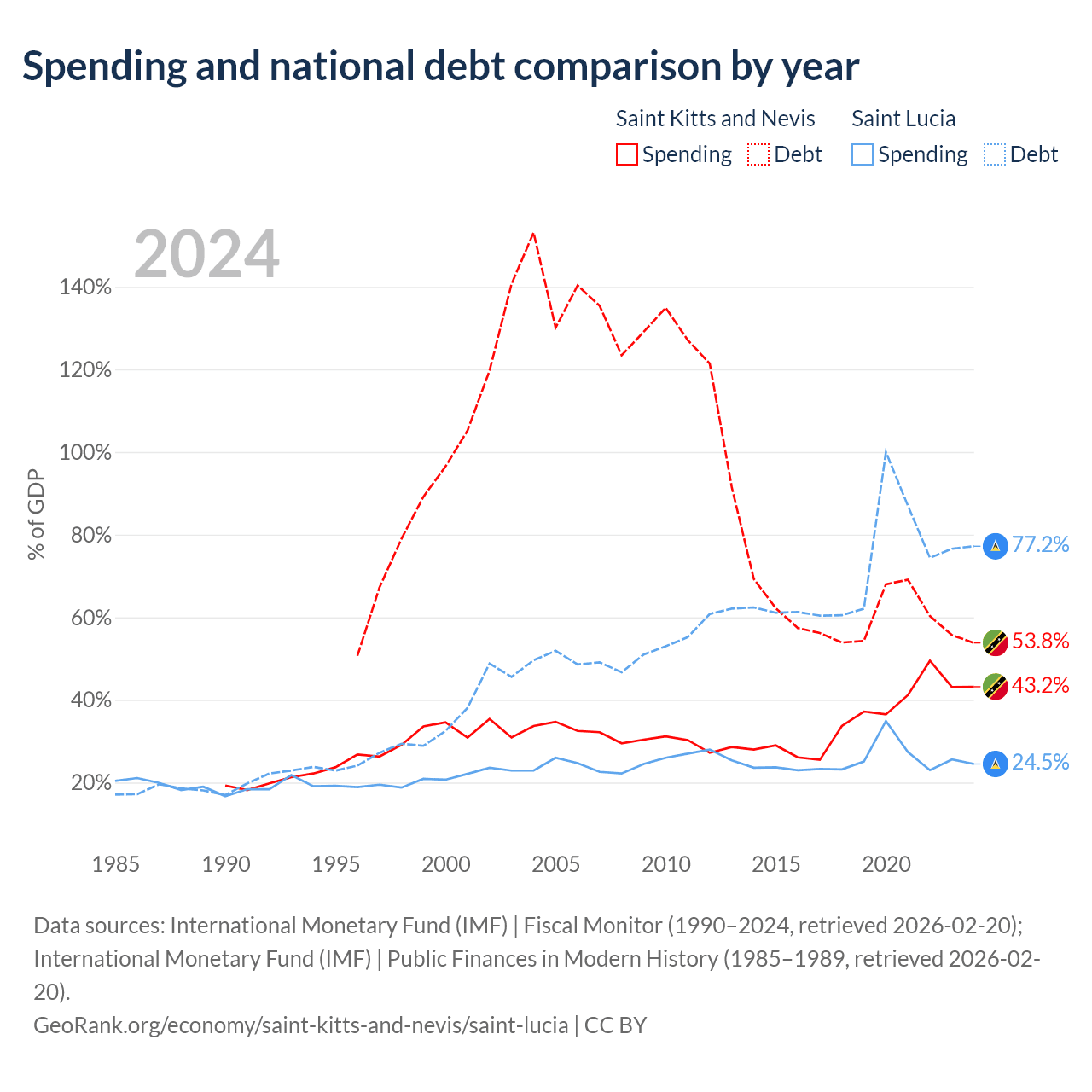Saint Kitts and Nevis has $604M in government debt (53.8% of GDP), compared to $1.97B (77.2% of GDP) in Saint Lucia.