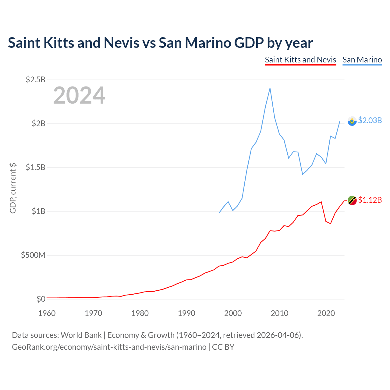 Saint Kitts and Nevis has a GDP of $1.12B compared to $2.03B for San Marino, ranking 187/197 and 180/197 by economy size, respectively.