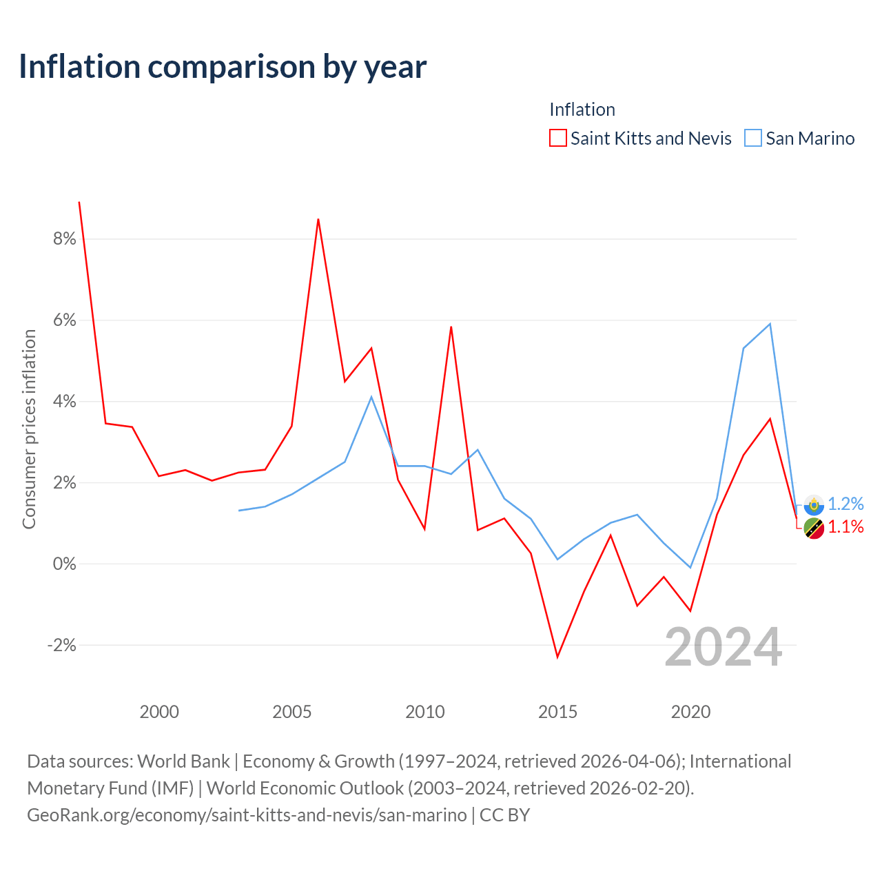 Over the past 22 years, Saint Kitts and Nevis has recorded an average annual inflation rate of 1.85%, compared with 1.95% in San Marino. In 2024, inflation was 1.1% in Saint Kitts and Nevis and 1.2% in San Marino.