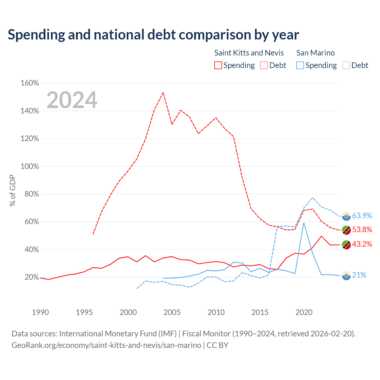 Saint Kitts and Nevis has $604M in government debt (53.8% of GDP), compared to $1.39B (63.9% of GDP) in San Marino.