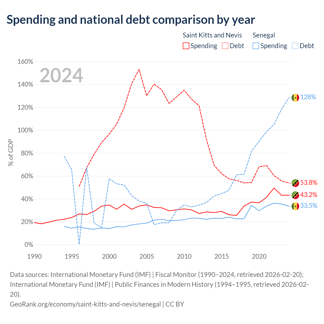 Saint Kitts and Nevis has $604M in government debt (53.8% of GDP), compared to $42.1B (128.4% of GDP) in Senegal.