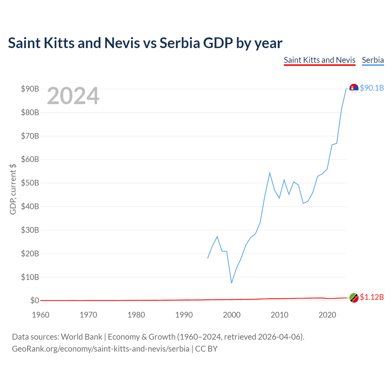 Saint Kitts and Nevis has a GDP of $1.12B compared to $90.1B for Serbia, ranking 187/197 and 76/197 by economy size, respectively.