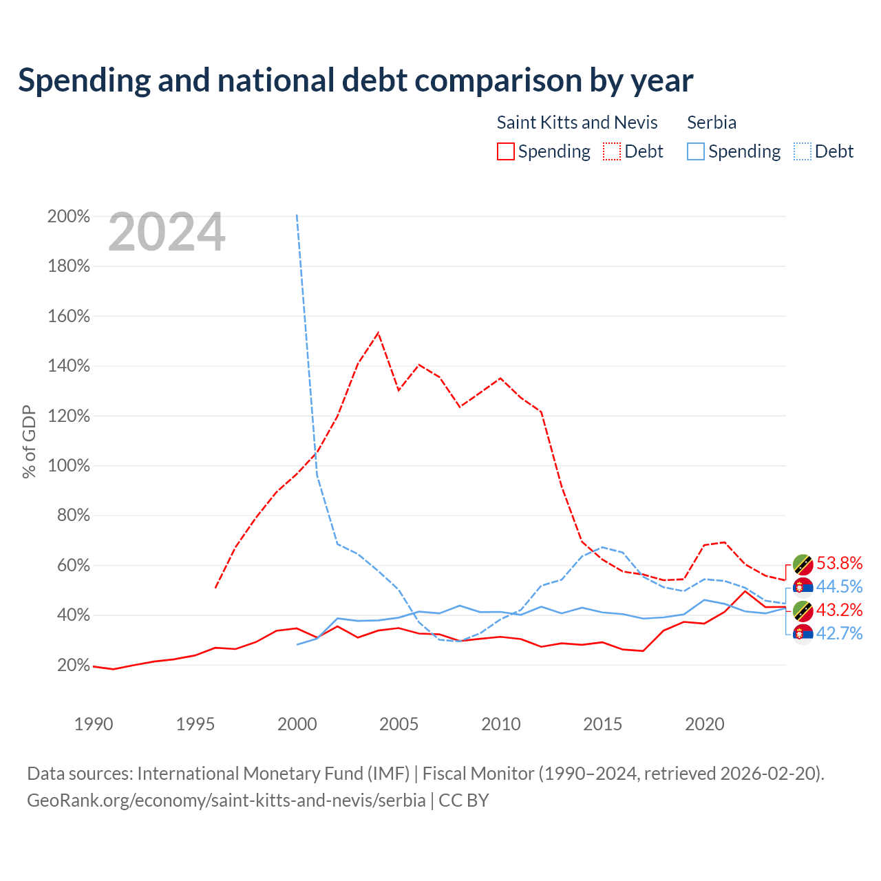 Saint Kitts and Nevis has $604M in government debt (53.8% of GDP), compared to $40.1B (44.5% of GDP) in Serbia.