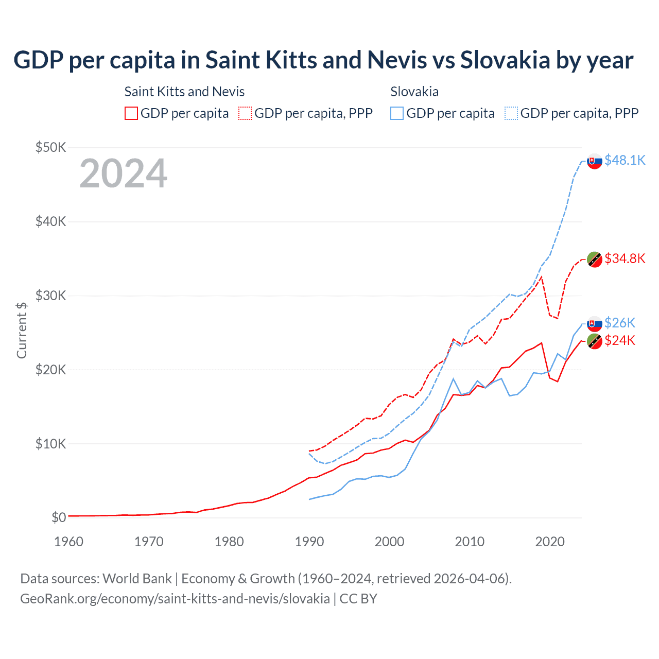 Saint Kitts and Nevis has a GDP of $1.12B compared to $141B for Slovakia, ranking 187/197 and 61/197 by economy size, respectively.