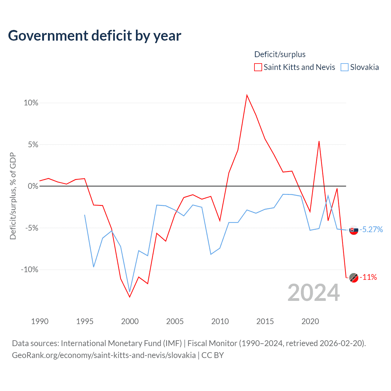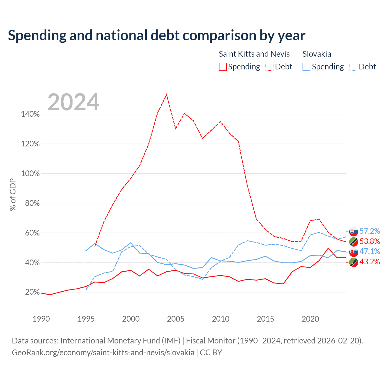 Saint Kitts and Nevis has $604M in government debt (53.8% of GDP), compared to $80.7B (57.2% of GDP) in Slovakia.