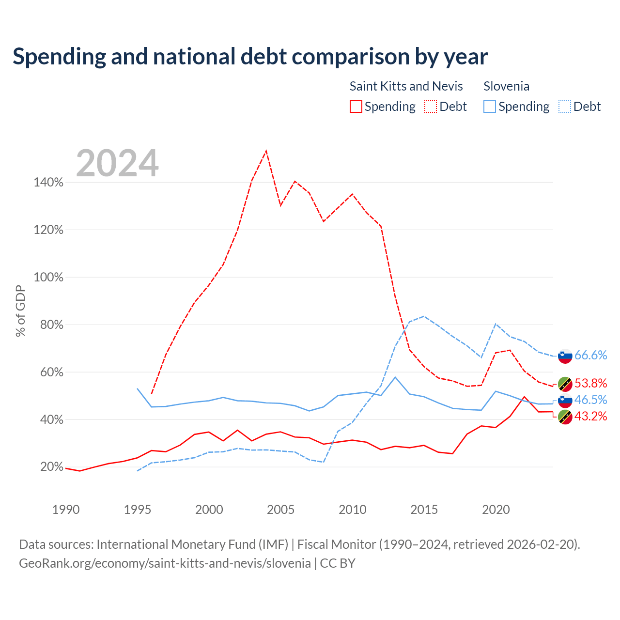 Saint Kitts and Nevis has $604M in government debt (53.8% of GDP), compared to $48.6B (66.6% of GDP) in Slovenia.