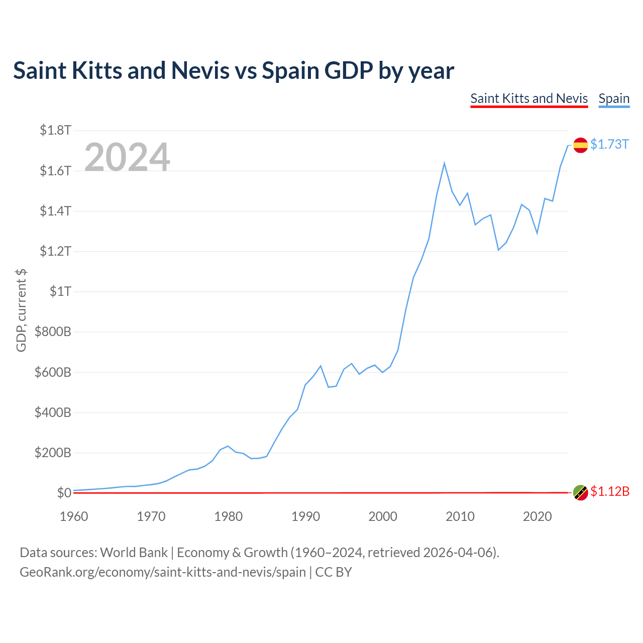 Saint Kitts and Nevis has a GDP of $1.12B compared to $1.73T for Spain, ranking 187/197 and 15/197 by economy size, respectively.