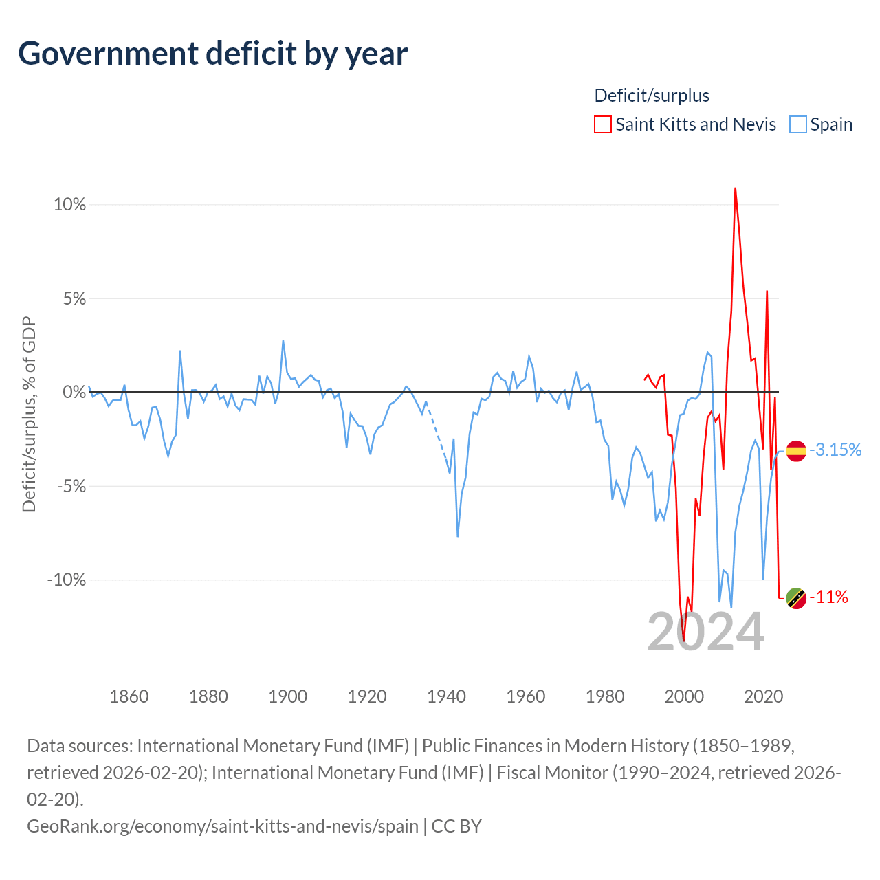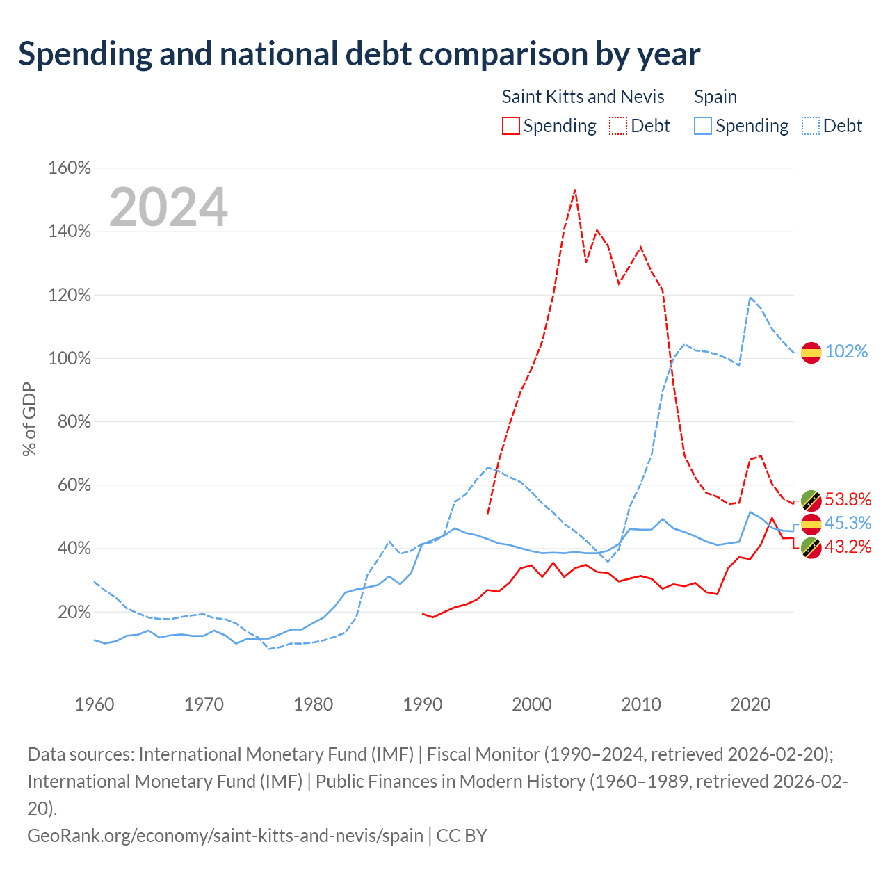 Saint Kitts and Nevis has $604M in government debt (53.8% of GDP), compared to $1.75T (101.6% of GDP) in Spain.