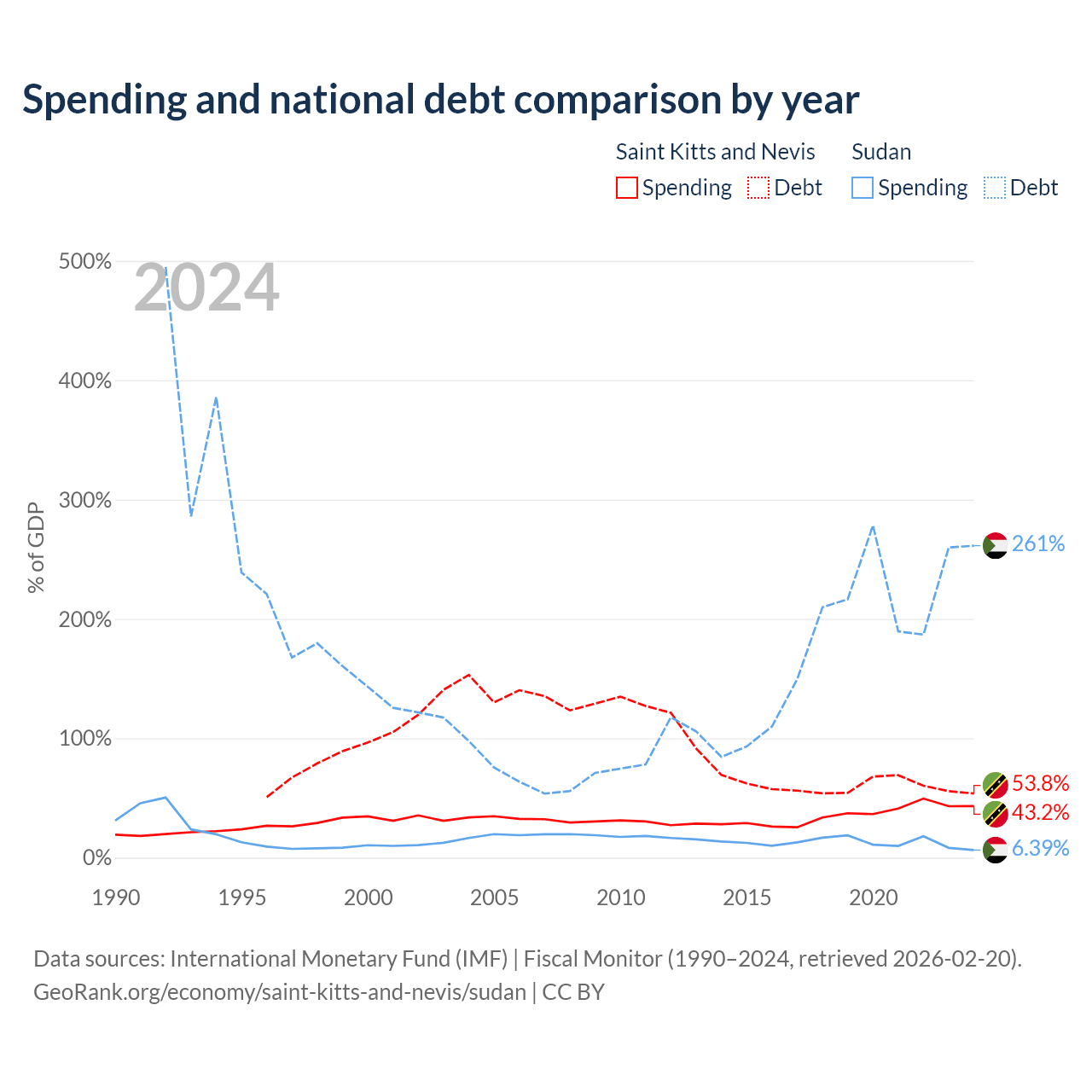 Saint Kitts and Nevis has $604M in government debt (53.8% of GDP), compared to $130B (261.4% of GDP) in Sudan.