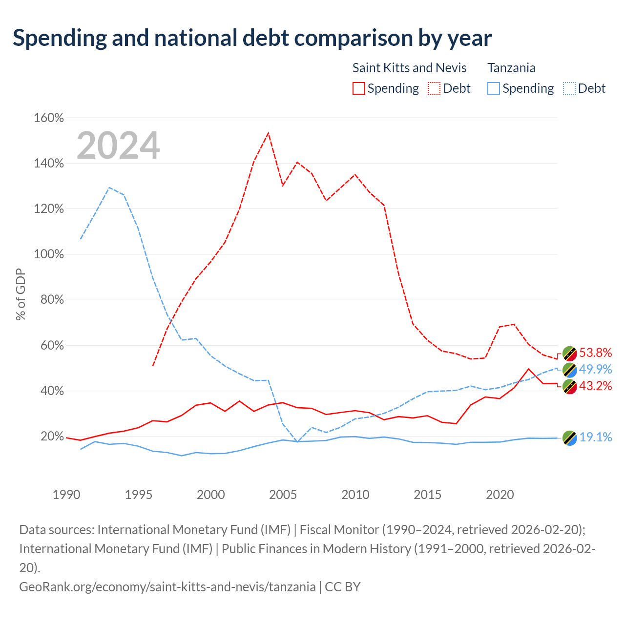 Saint Kitts and Nevis has $604M in government debt (53.8% of GDP), compared to $39.3B (49.9% of GDP) in Tanzania.