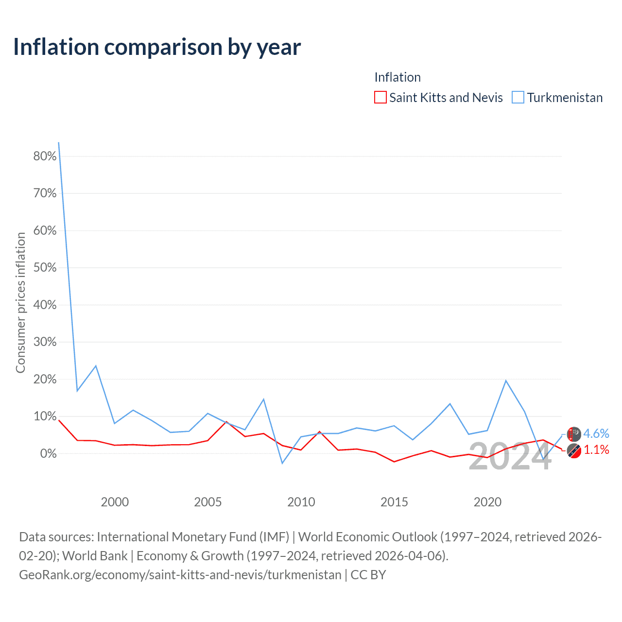 Over the past 28 years, Saint Kitts and Nevis has recorded an average annual inflation rate of 2.25%, compared with 10.9% in Turkmenistan. In 2024, inflation was 1.1% in Saint Kitts and Nevis and 4.6% in Turkmenistan.