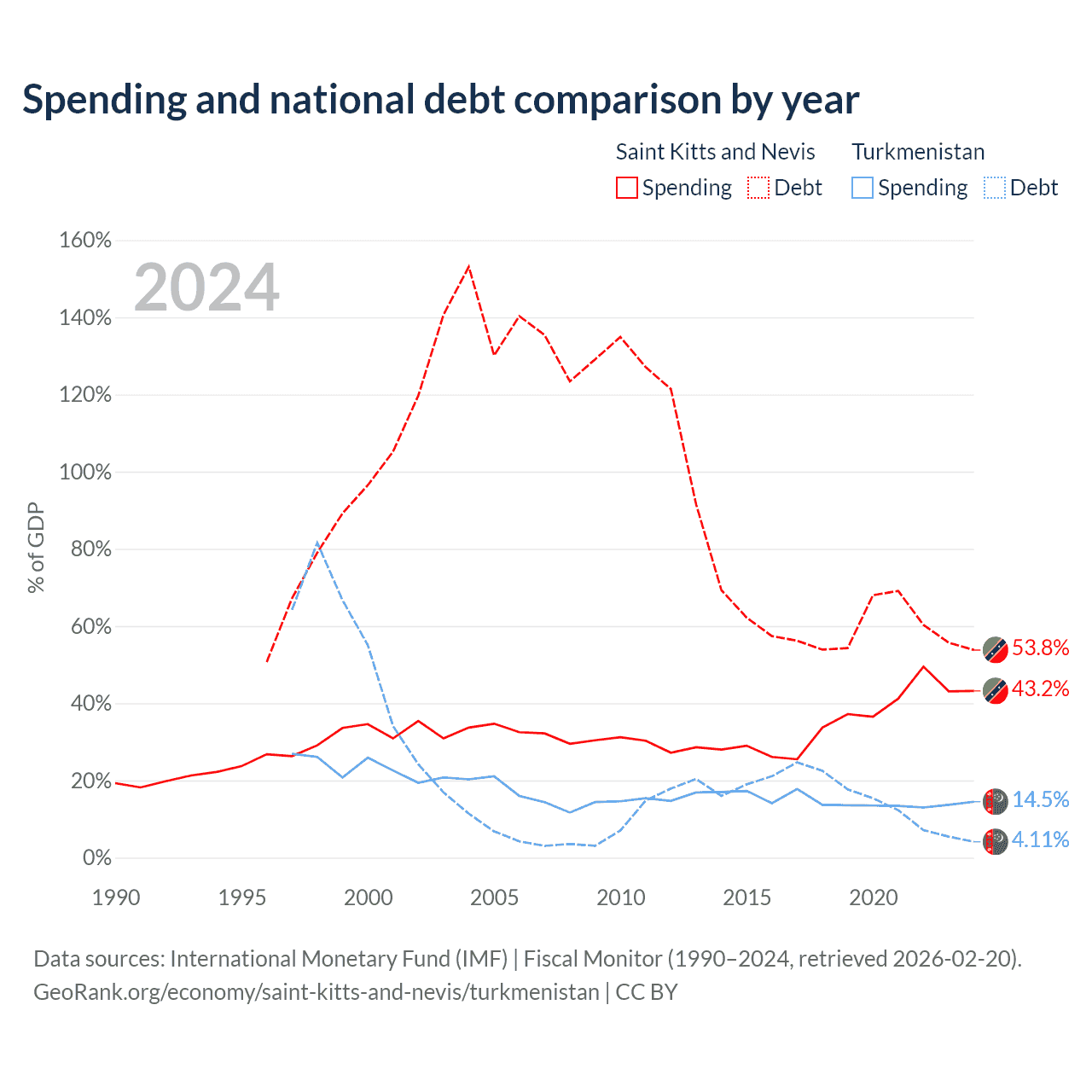 Saint Kitts and Nevis has $604M in government debt (53.8% of GDP), compared to $2.11B (4.11% of GDP) in Turkmenistan.