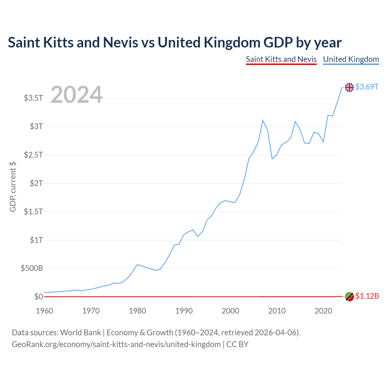 Saint Kitts and Nevis has a GDP of $1.12B compared to $3.69T for the United Kingdom, ranking 187/197 and 6/197 by economy size, respectively.