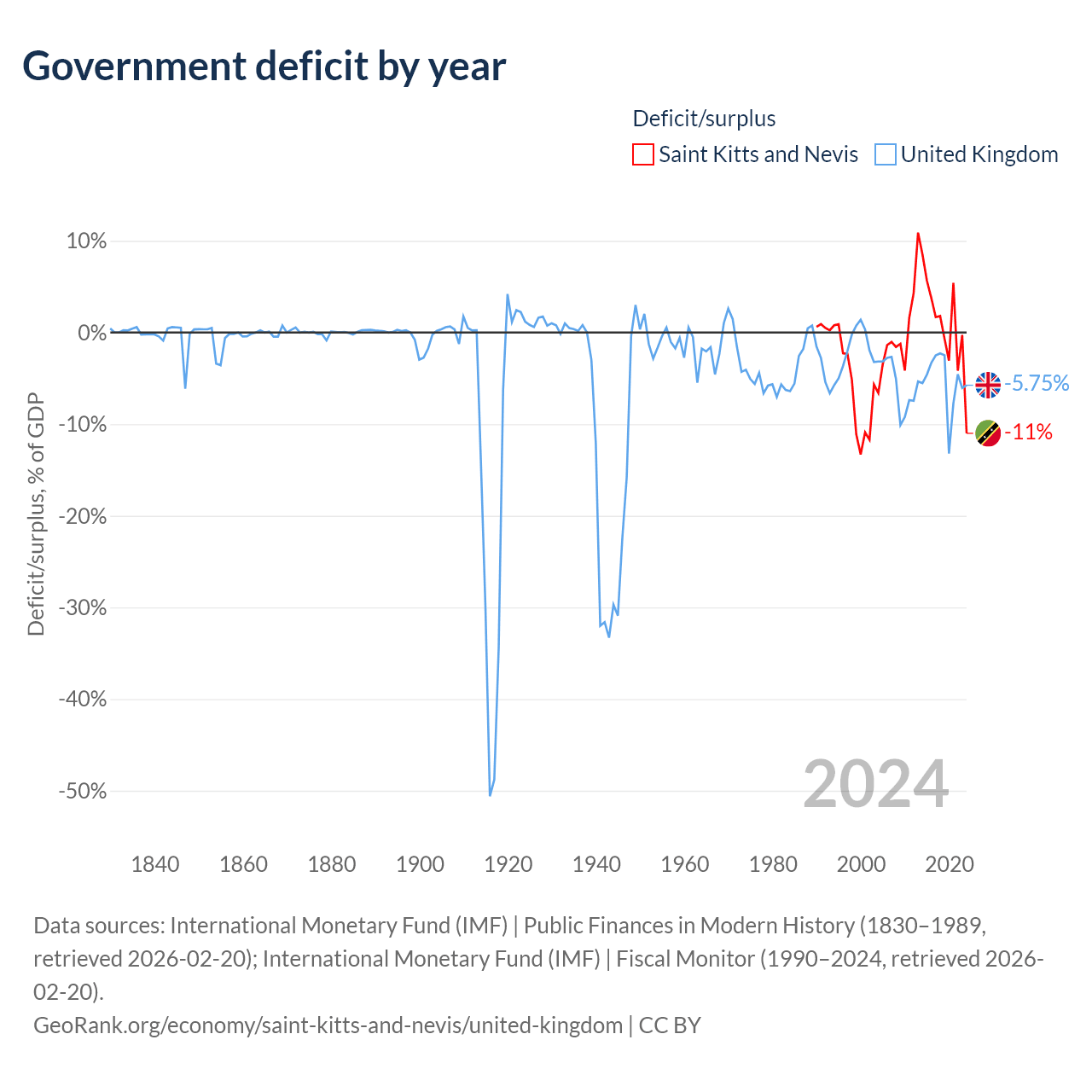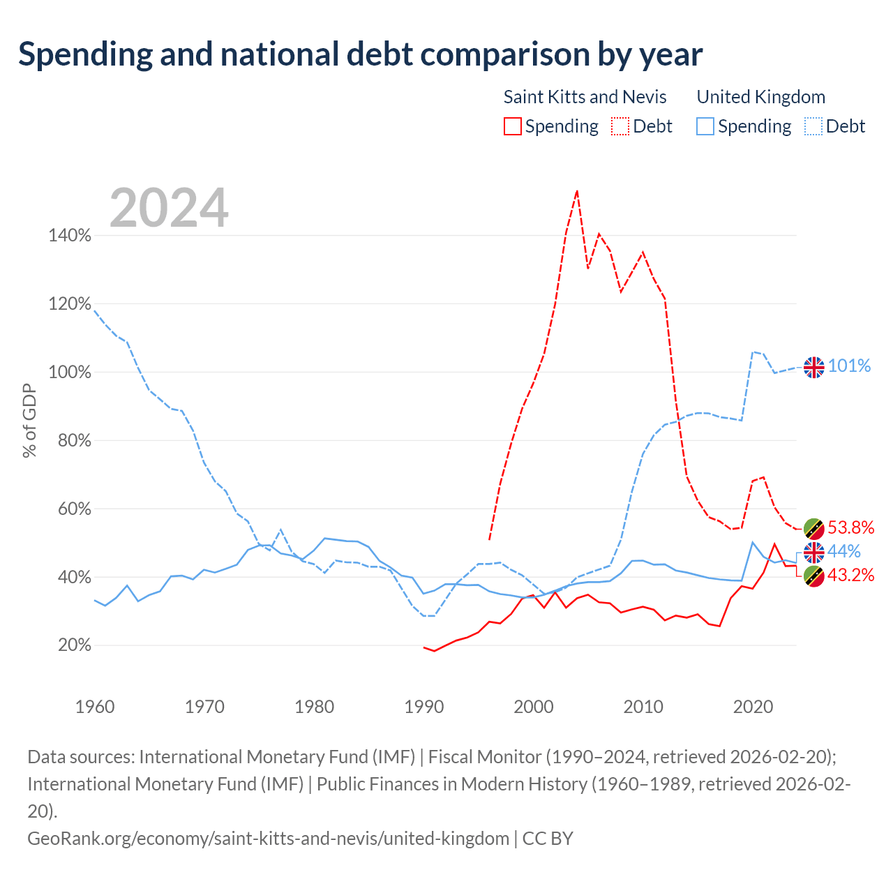 Saint Kitts and Nevis has $604M in government debt (53.8% of GDP), compared to $3.73T (101.2% of GDP) in the United Kingdom.