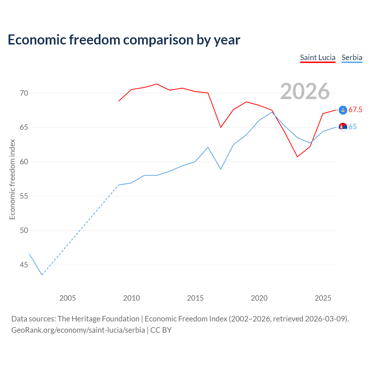 The Economic Freedom Index for Saint Lucia is 67.5, ranking 57/197, compared to 65 for Serbia, ranking 68/197. The chart above displays a comparison of annual changes in economic freedom indexes.
