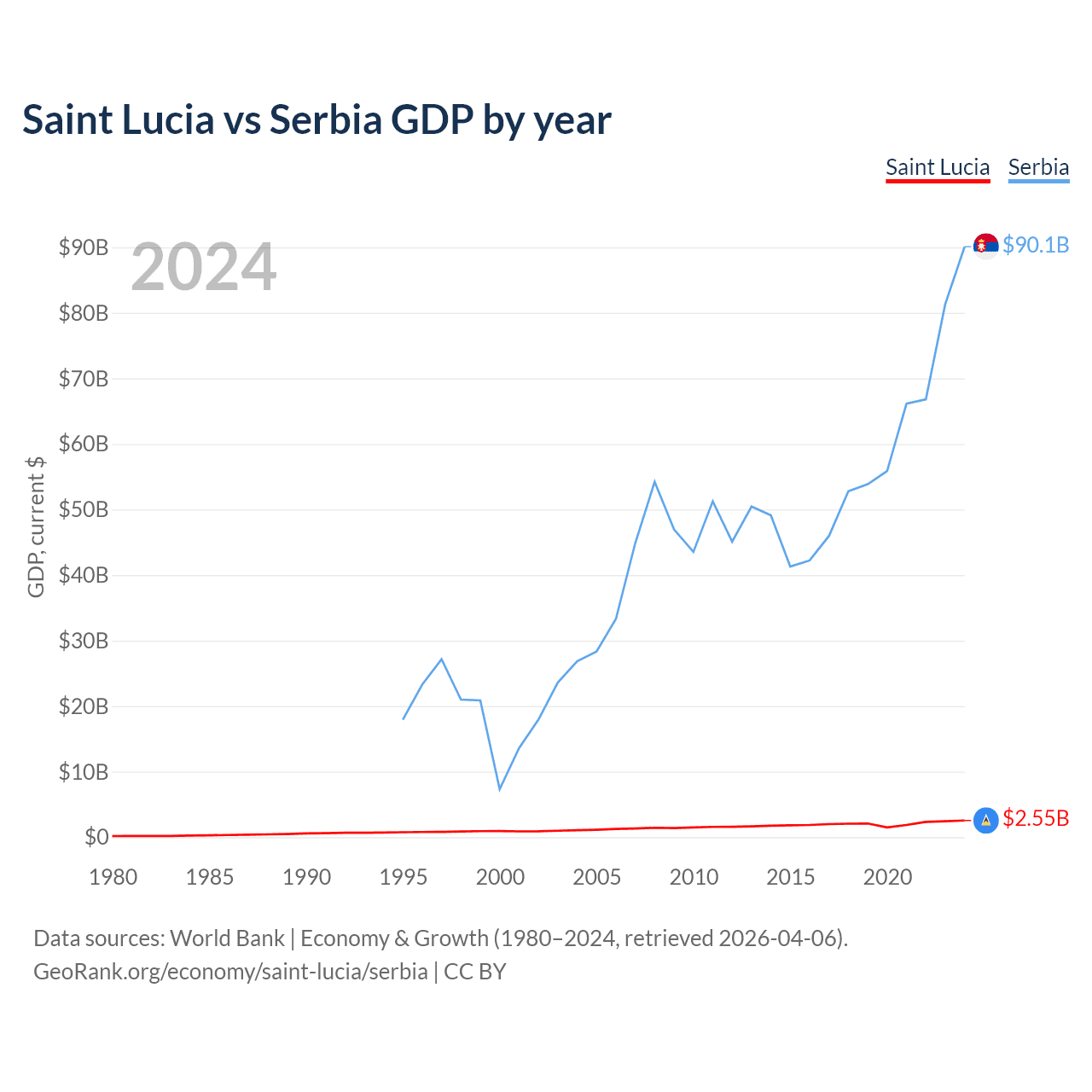 Saint Lucia has a GDP of $2.55B compared to $90.1B for Serbia, ranking 173/197 and 76/197 by economy size, respectively.