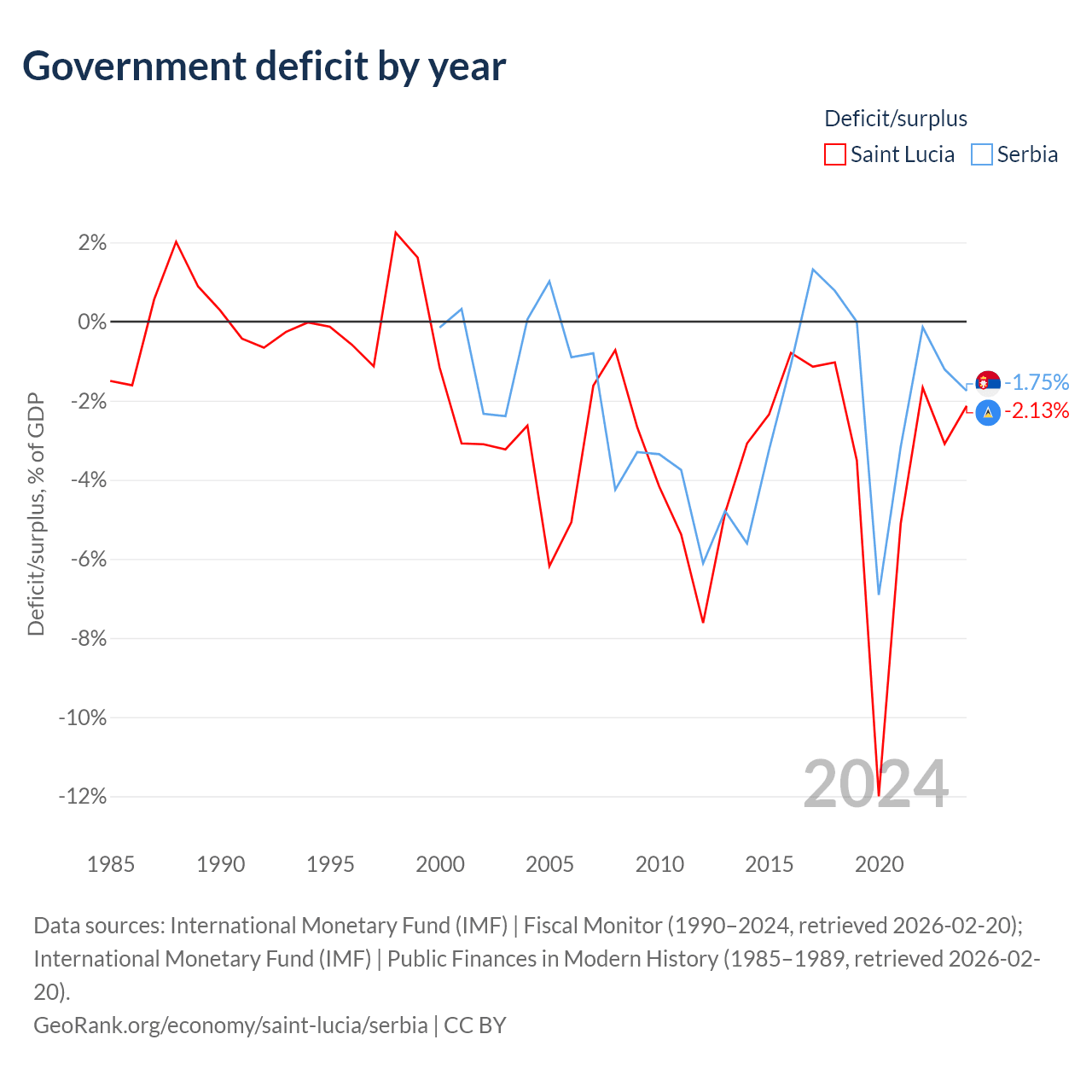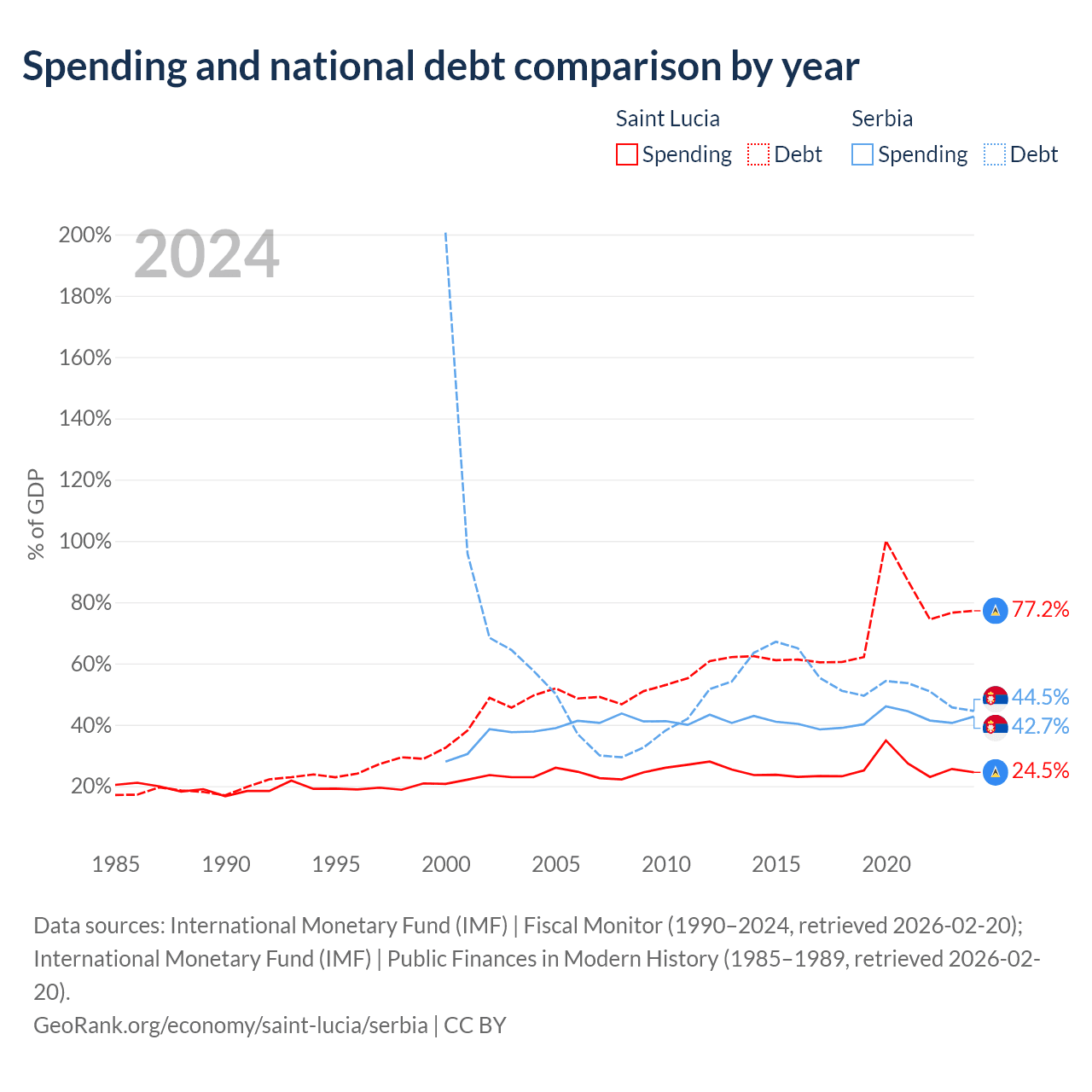 Saint Lucia has $1.97B in government debt (77.2% of GDP), compared to $40.1B (44.5% of GDP) in Serbia.