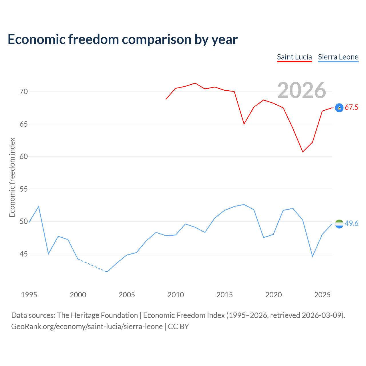 The Economic Freedom Index for Saint Lucia is 67.5, ranking 57/197, compared to 49.6 for Sierra Leone, ranking 165/197. The chart above displays a comparison of annual changes in economic freedom indexes.