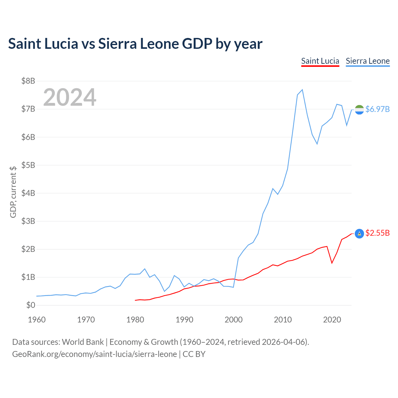 Saint Lucia has a GDP of $2.55B compared to $6.97B for Sierra Leone, ranking 173/197 and 160/197 by economy size, respectively.