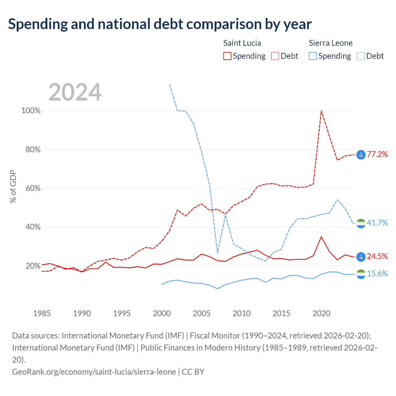 Saint Lucia has $1.97B in government debt (77.2% of GDP), compared to $2.91B (41.7% of GDP) in Sierra Leone.