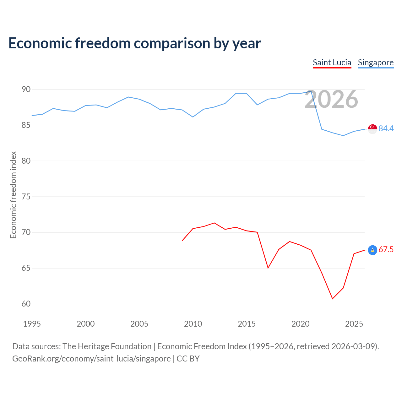 The Economic Freedom Index for Saint Lucia is 67.5, ranking 57/197, compared to 84.4 for Singapore, ranking 1/197. The chart above displays a comparison of annual changes in economic freedom indexes.
