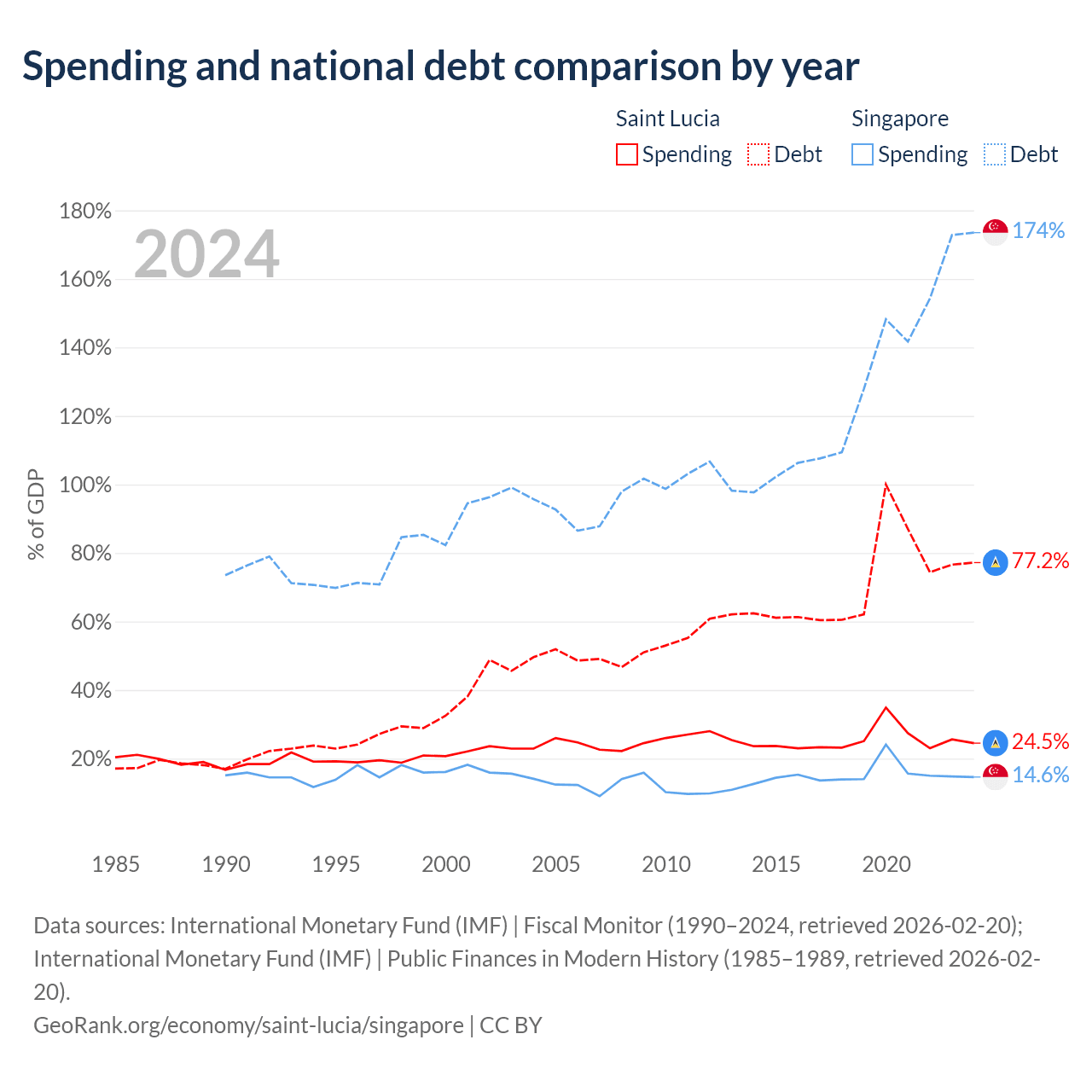Saint Lucia has $1.97B in government debt (77.2% of GDP), compared to $950B (173.5% of GDP) in Singapore.