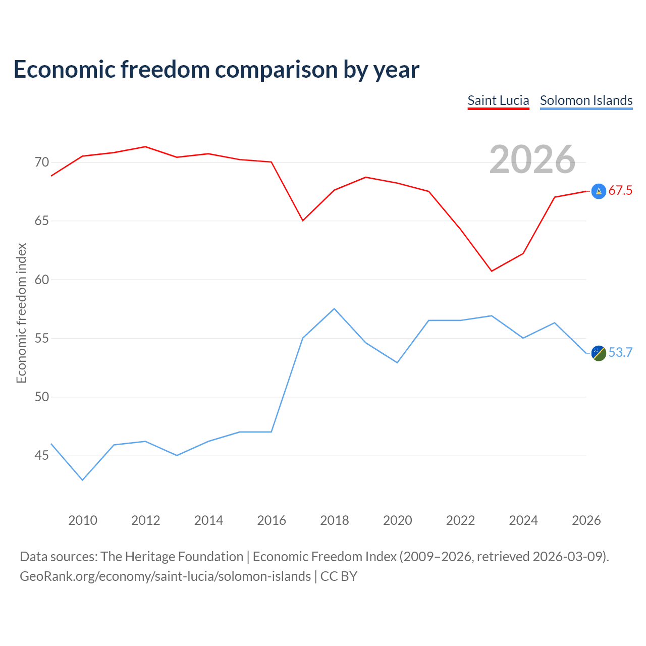 The Economic Freedom Index for Saint Lucia is 67.5, ranking 57/197, compared to 53.7 for the Solomon Islands, ranking 137/197. The chart above displays a comparison of annual changes in economic freedom indexes.