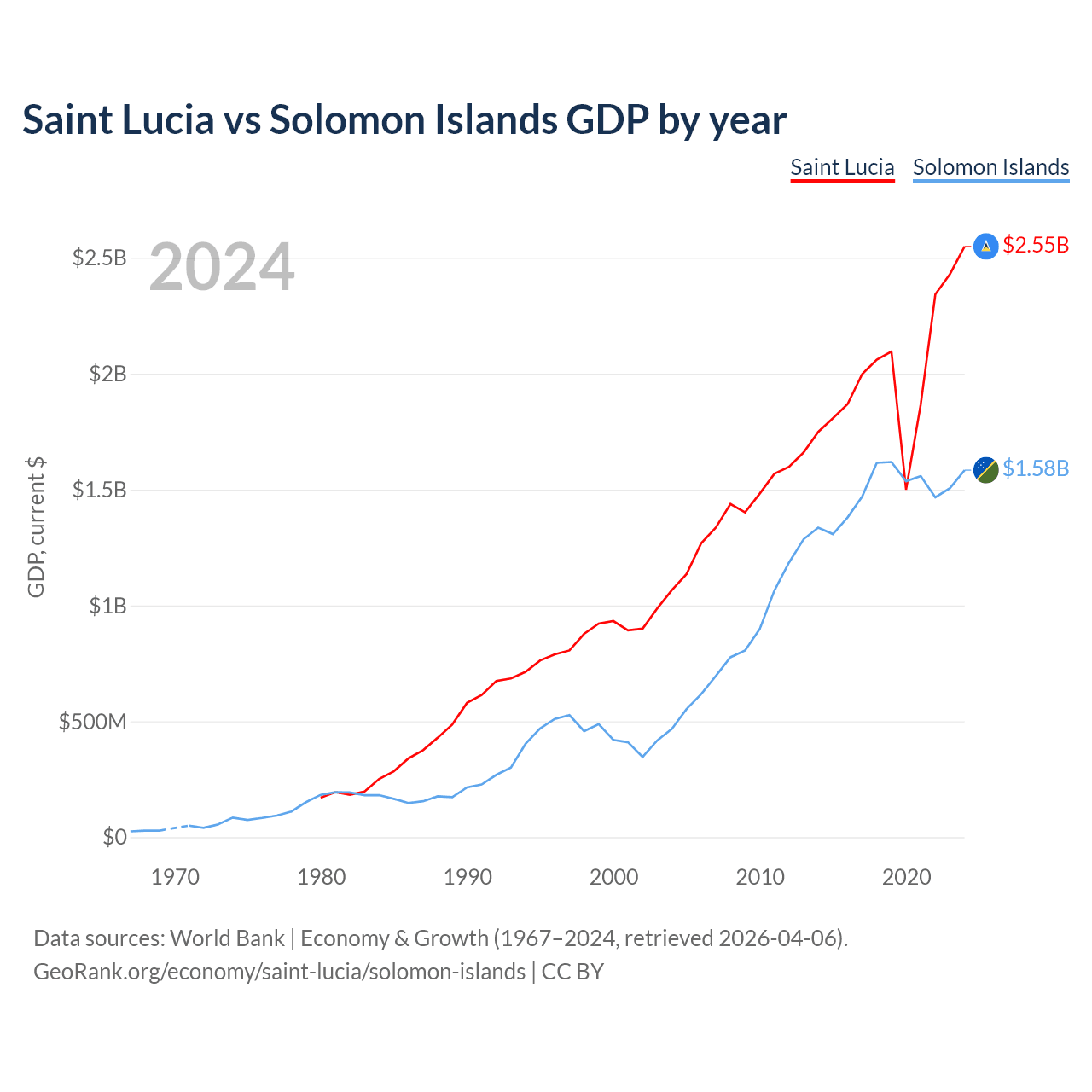 Saint Lucia has a GDP of $2.55B compared to $1.58B for the Solomon Islands, ranking 173/197 and 182/197 by economy size, respectively.