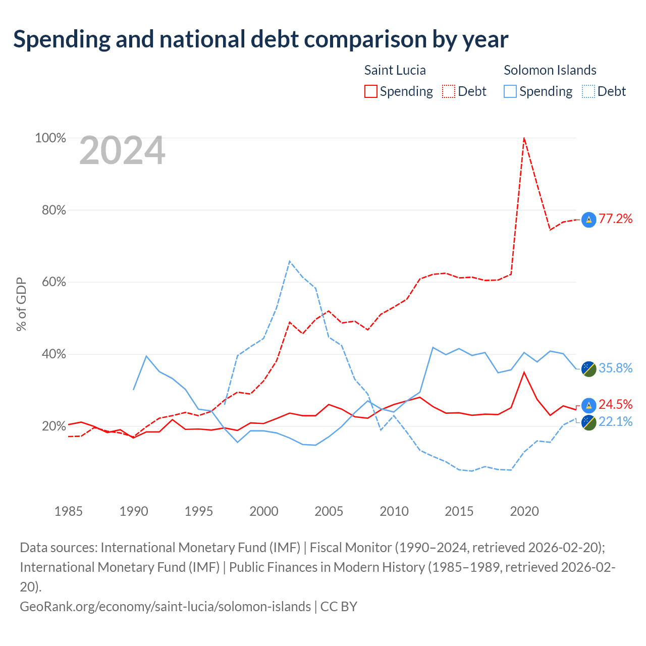 Saint Lucia has $1.97B in government debt (77.2% of GDP), compared to $350M (22.1% of GDP) in the Solomon Islands.