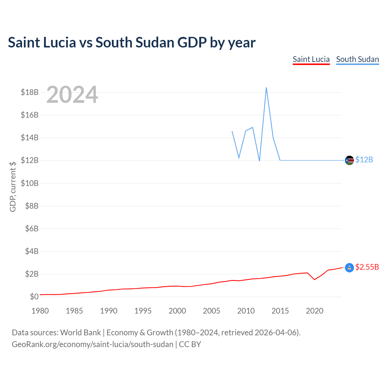 Saint Lucia has a GDP of $2.55B compared to $12B for South Sudan, ranking 173/197 and 149/197 by economy size, respectively.