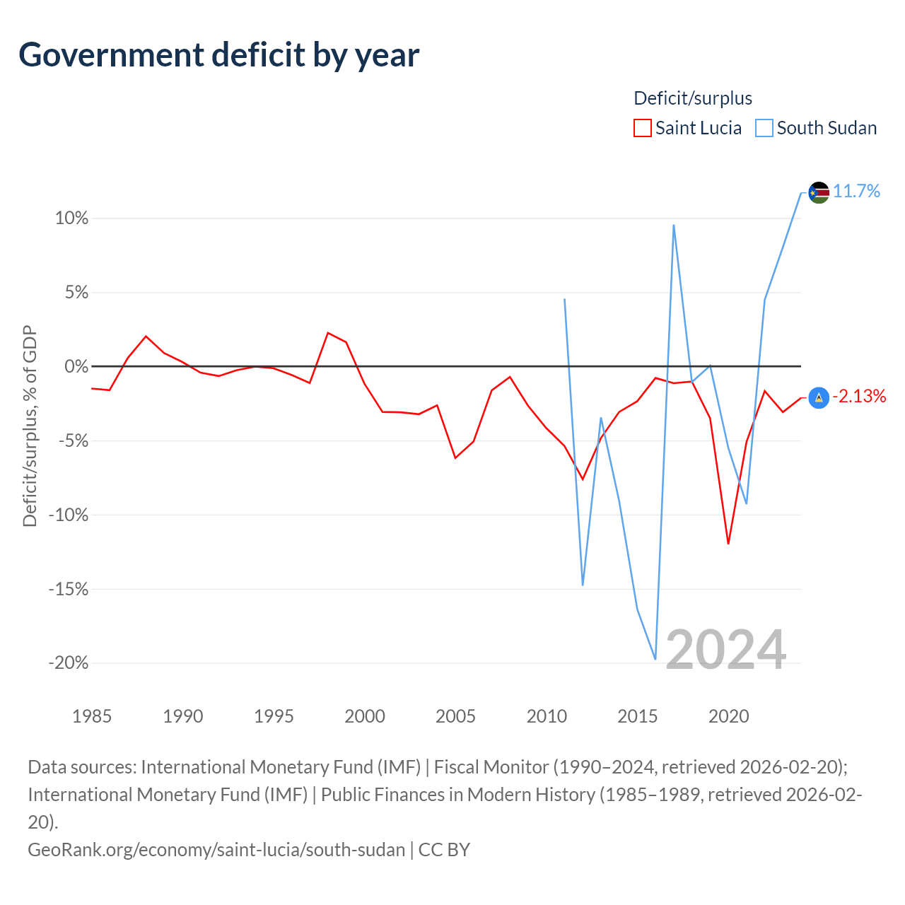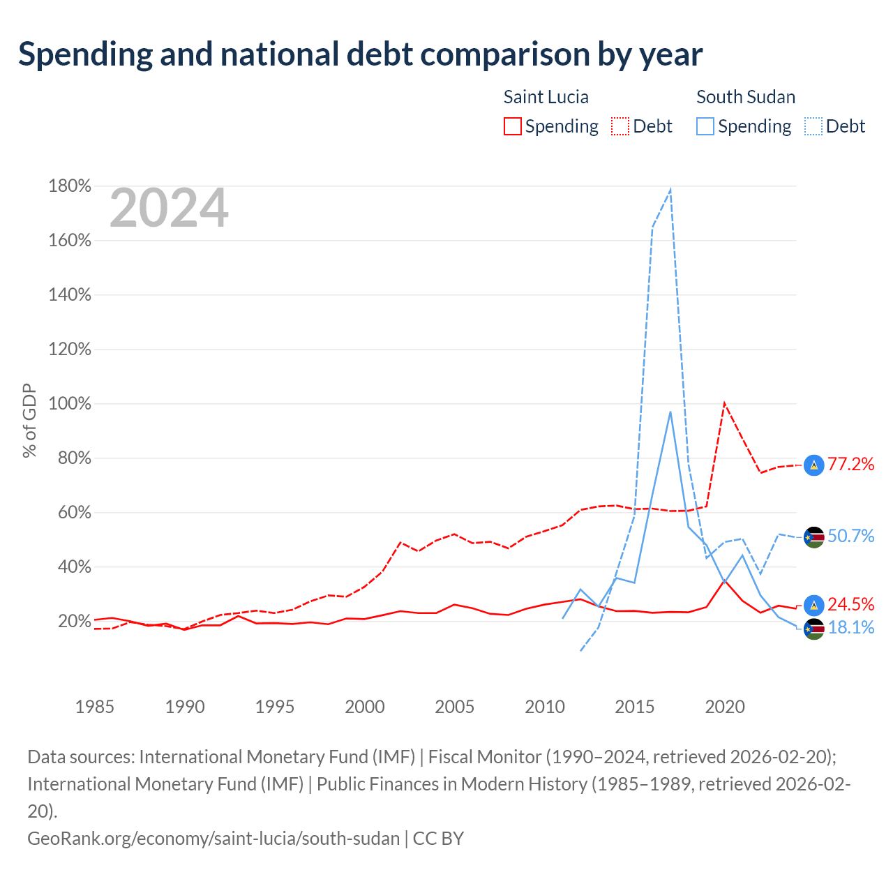 Saint Lucia has $1.97B in government debt (77.2% of GDP), compared to $7.04B (50.7% of GDP) in South Sudan.