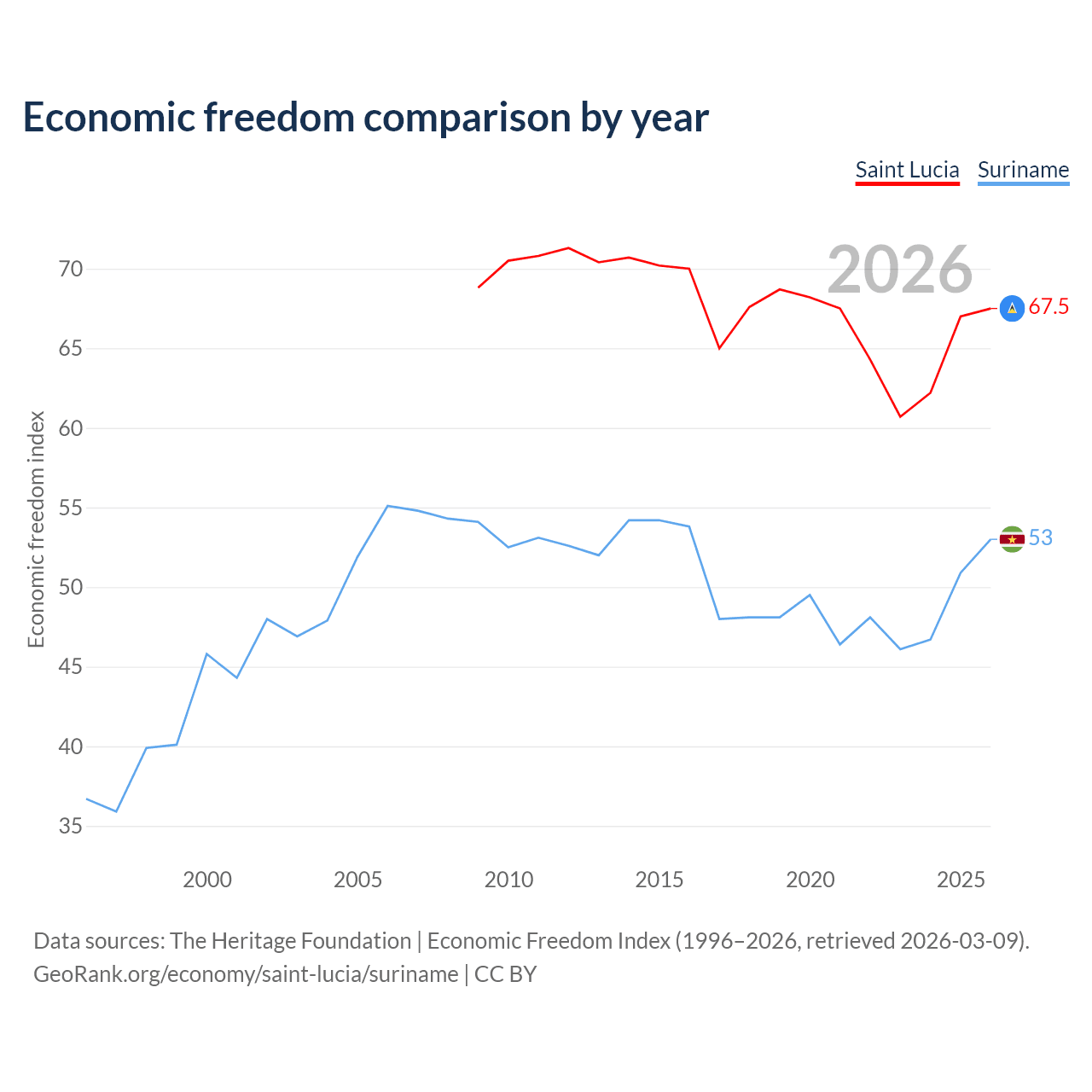 The Economic Freedom Index for Saint Lucia is 67.5, ranking 57/197, compared to 53 for Suriname, ranking 143/197. The chart above displays a comparison of annual changes in economic freedom indexes.