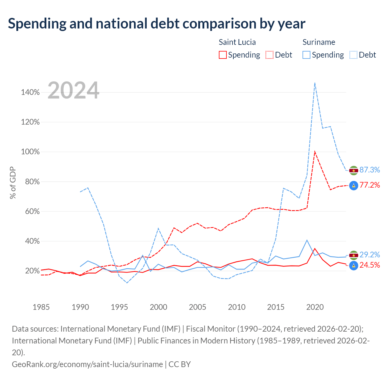 Saint Lucia has $1.97B in government debt (77.2% of GDP), compared to $3.86B (87.3% of GDP) in Suriname.