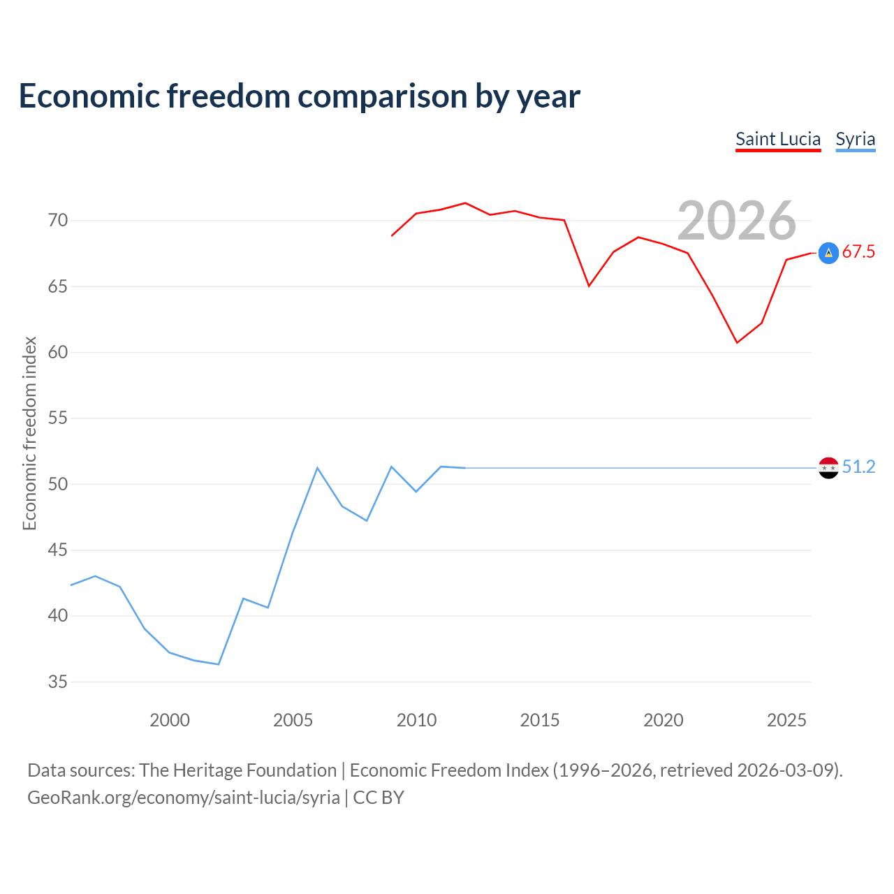 The Economic Freedom Index for Saint Lucia is 67.5, ranking 57/197, compared to 51.2 for Syria, ranking 155/197. The chart above displays a comparison of annual changes in economic freedom indexes.
