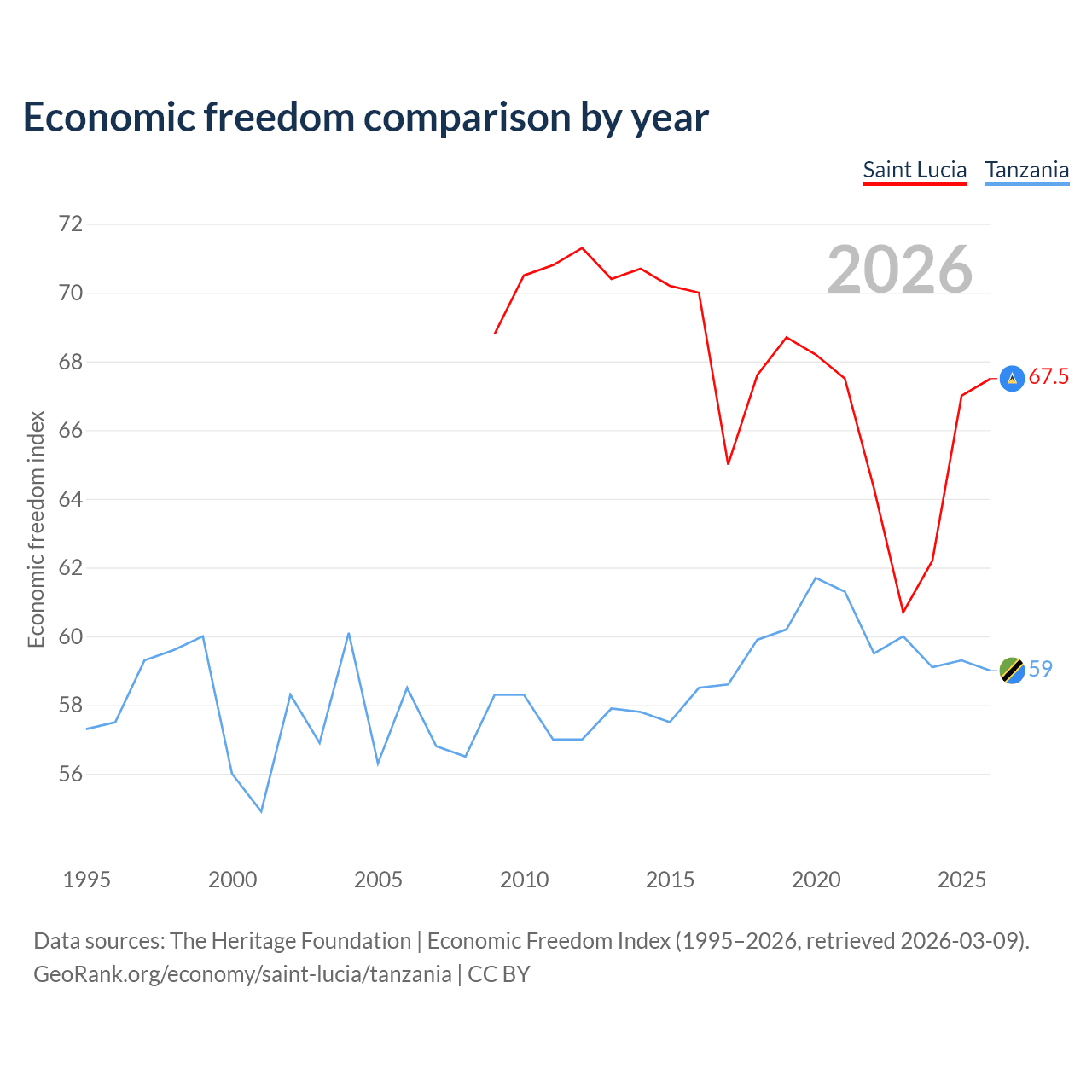 The Economic Freedom Index for Saint Lucia is 67.5, ranking 57/197, compared to 59 for Tanzania, ranking 106/197. The chart above displays a comparison of annual changes in economic freedom indexes.