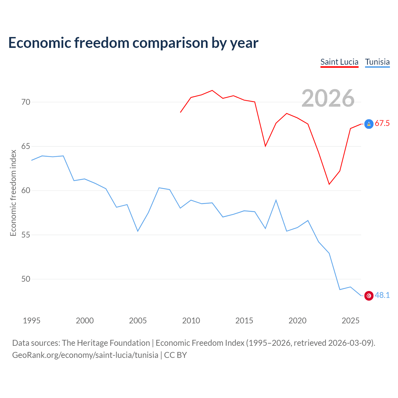 The Economic Freedom Index for Saint Lucia is 67.5, ranking 57/197, compared to 48.1 for Tunisia, ranking 172/197. The chart above displays a comparison of annual changes in economic freedom indexes.