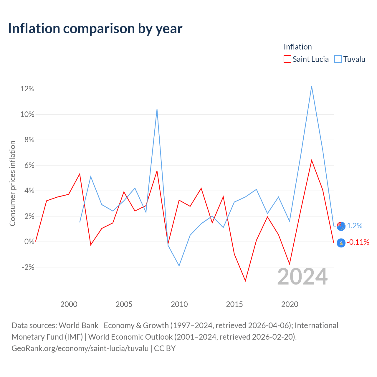 Over the past 24 years, Saint Lucia has recorded an average annual inflation rate of 1.95%, compared with 3.34% in Tuvalu. In 2024, inflation was -0.11% in Saint Lucia and 1.2% in Tuvalu.