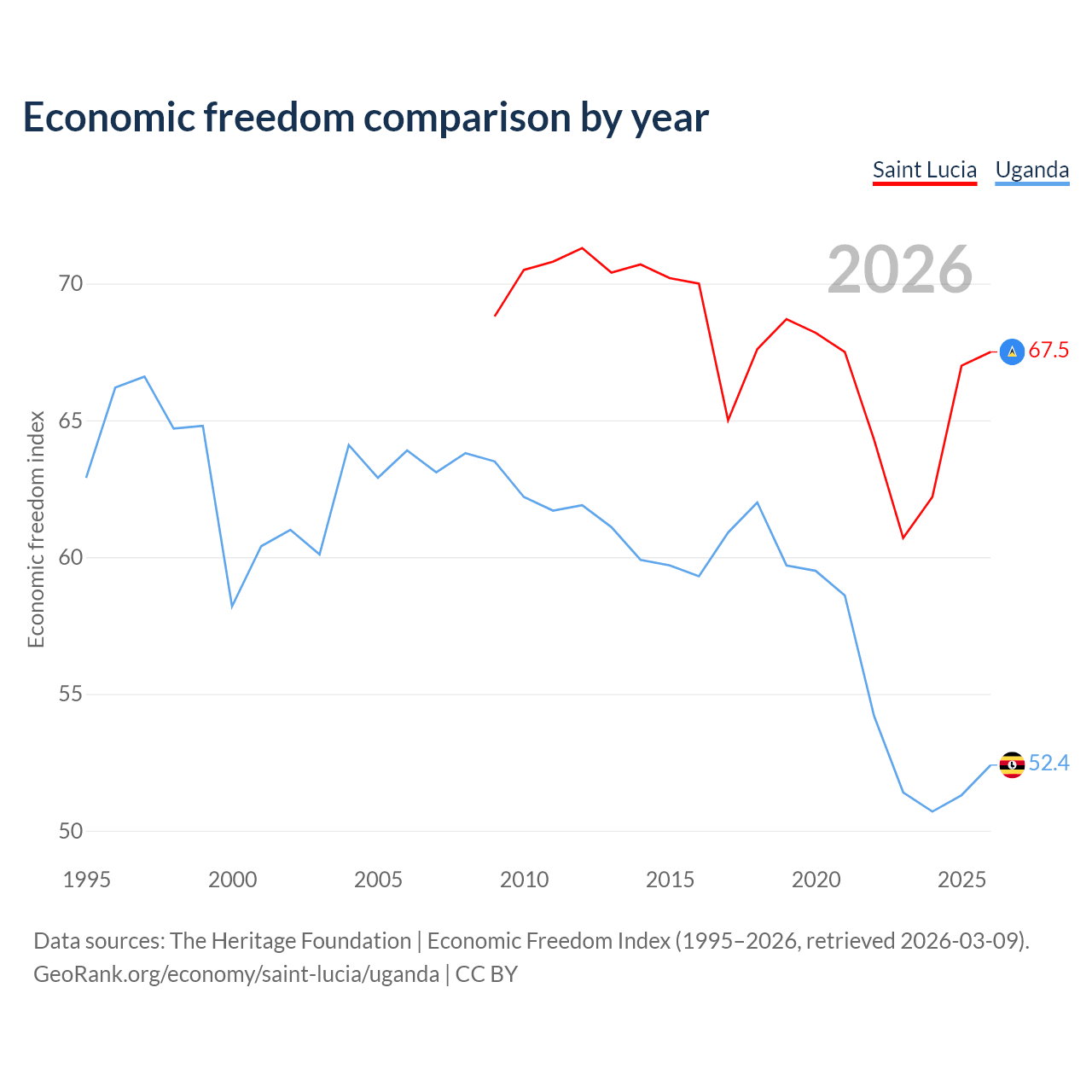 The Economic Freedom Index for Saint Lucia is 67.5, ranking 57/197, compared to 52.4 for Uganda, ranking 149/197. The chart above displays a comparison of annual changes in economic freedom indexes.