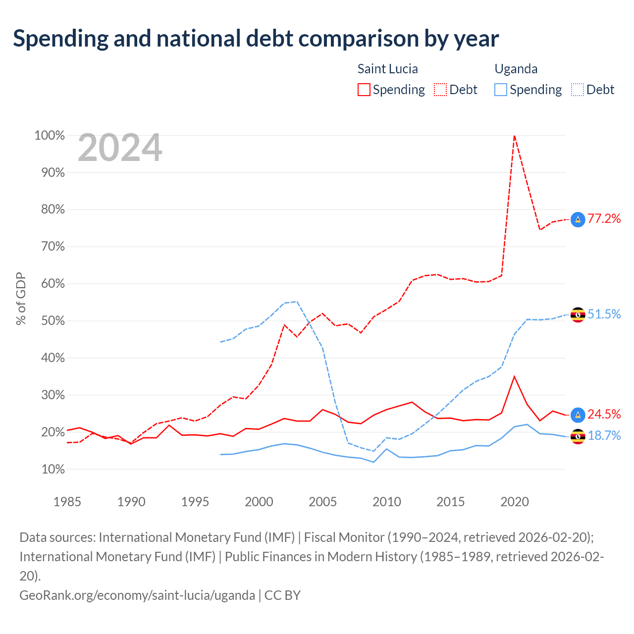Saint Lucia has $1.97B in government debt (77.2% of GDP), compared to $27.8B (51.5% of GDP) in Uganda.