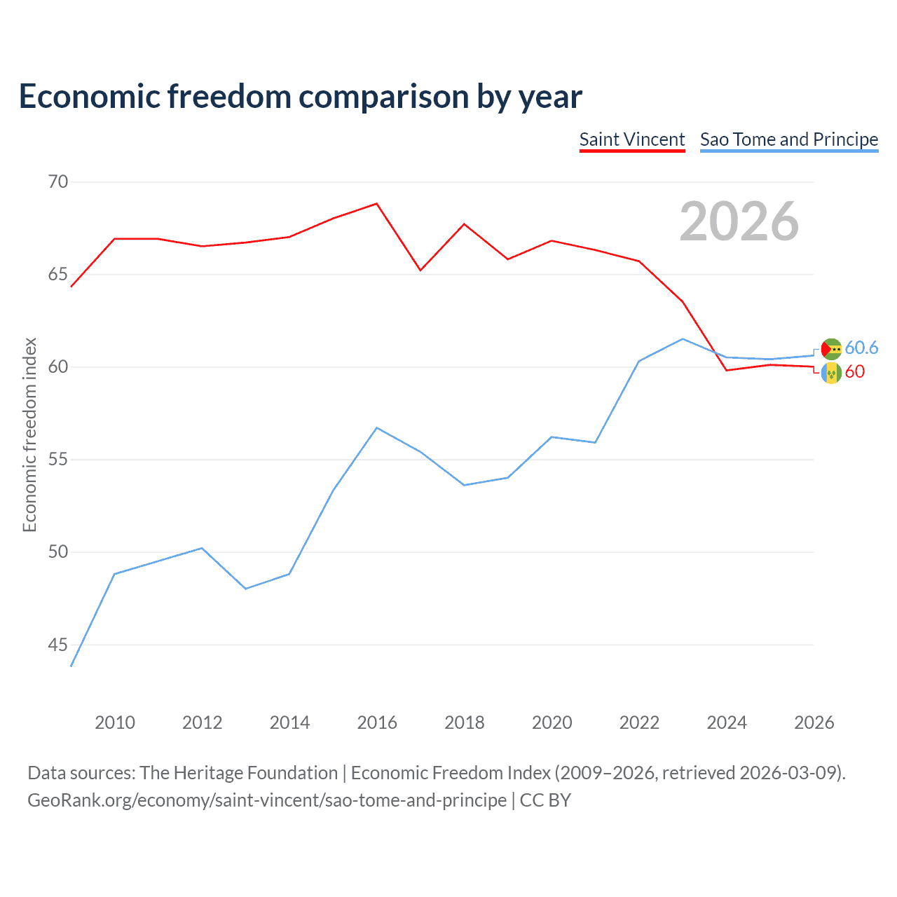 The Economic Freedom Index for Saint Vincent is 60, ranking 98/197, compared to 60.6 for Sao Tome and Principe, ranking 93/197. The chart above displays a comparison of annual changes in economic freedom indexes.
