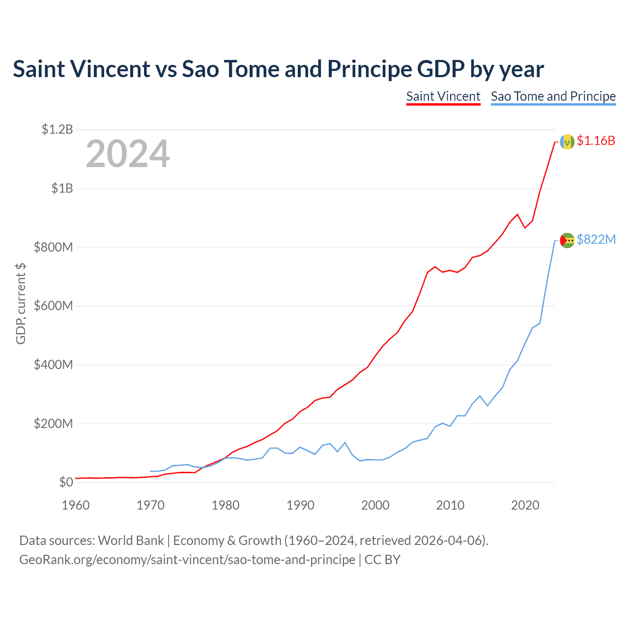 Saint Vincent has a GDP of $1.16B compared to $822M for Sao Tome and Principe, ranking 186/197 and 189/197 by economy size, respectively.
