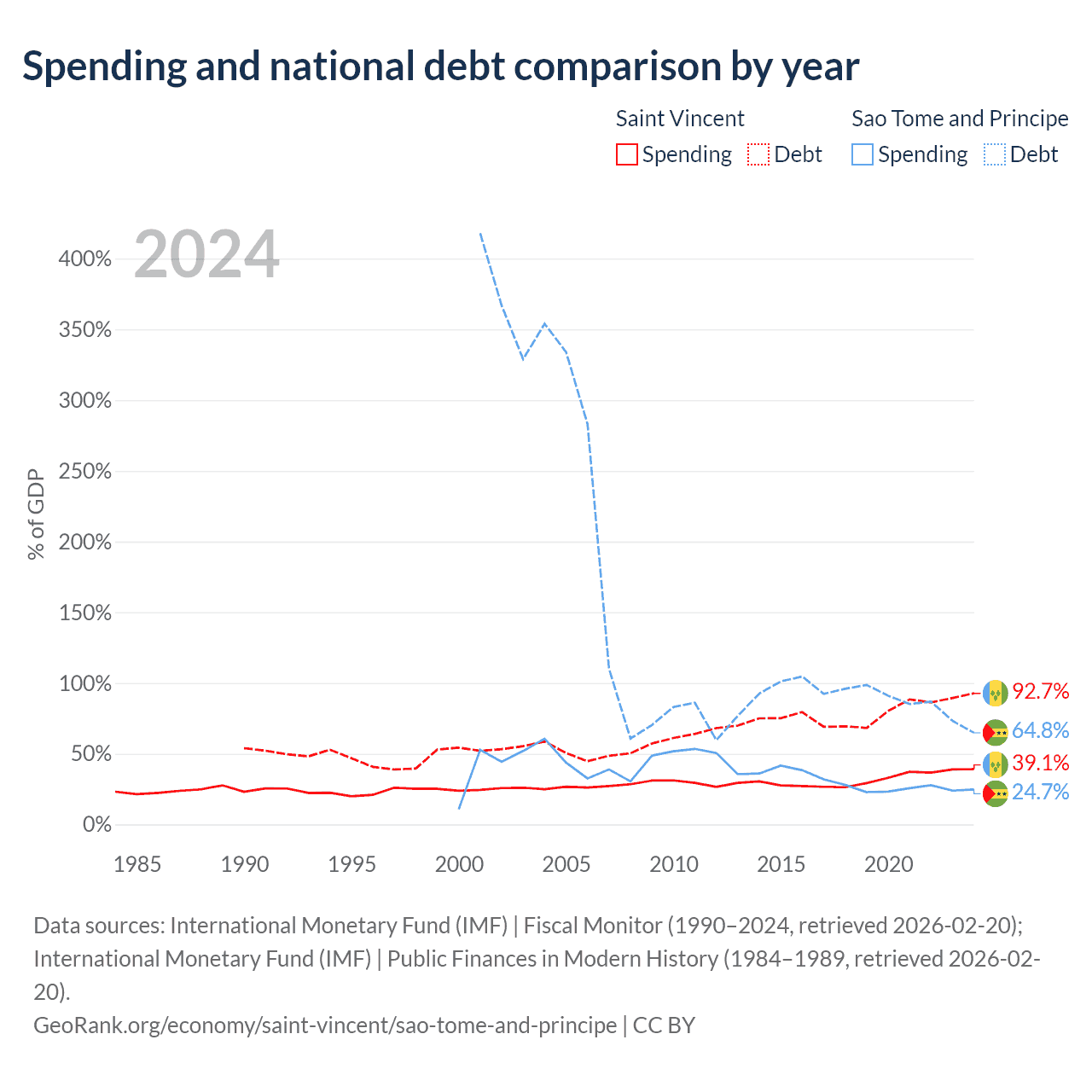 Saint Vincent has $1.07B in government debt (92.7% of GDP), compared to $533M (64.8% of GDP) in Sao Tome and Principe.